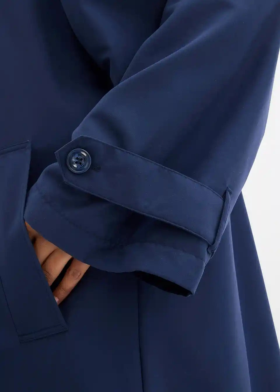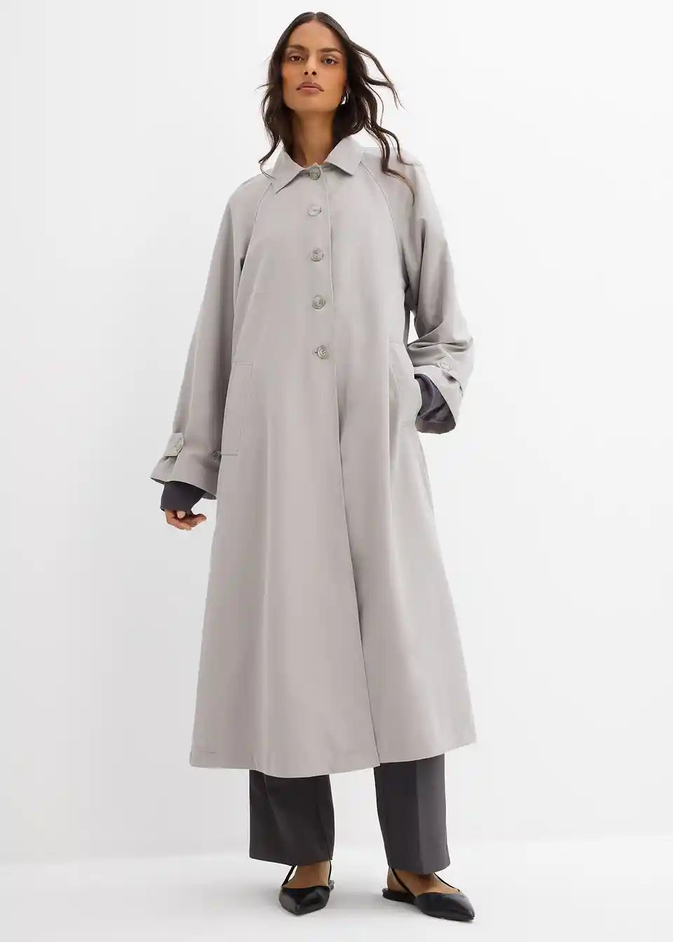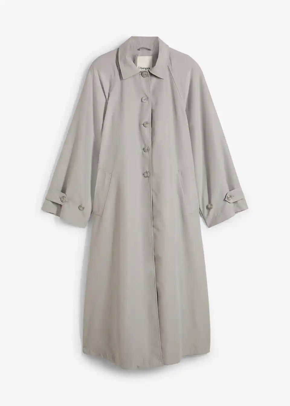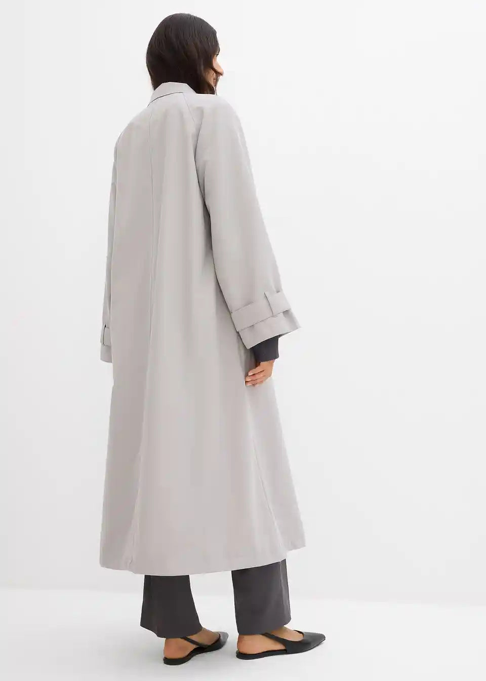 Wadenlanger, einreihiger Trenchcoat mit Kragen, verstellbaren Ärmelriegeln und seitlichen Leistentaschen.