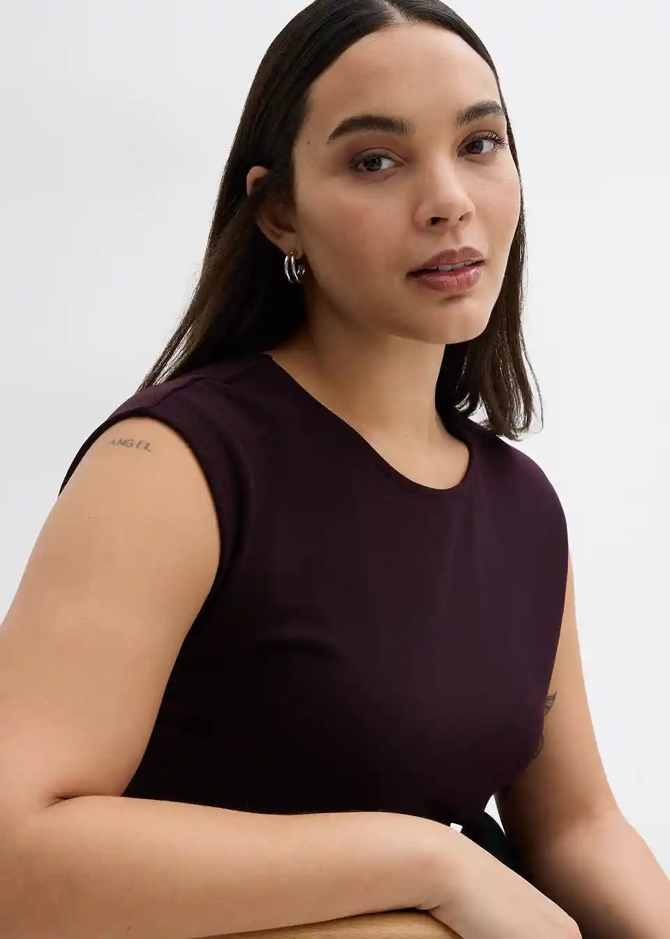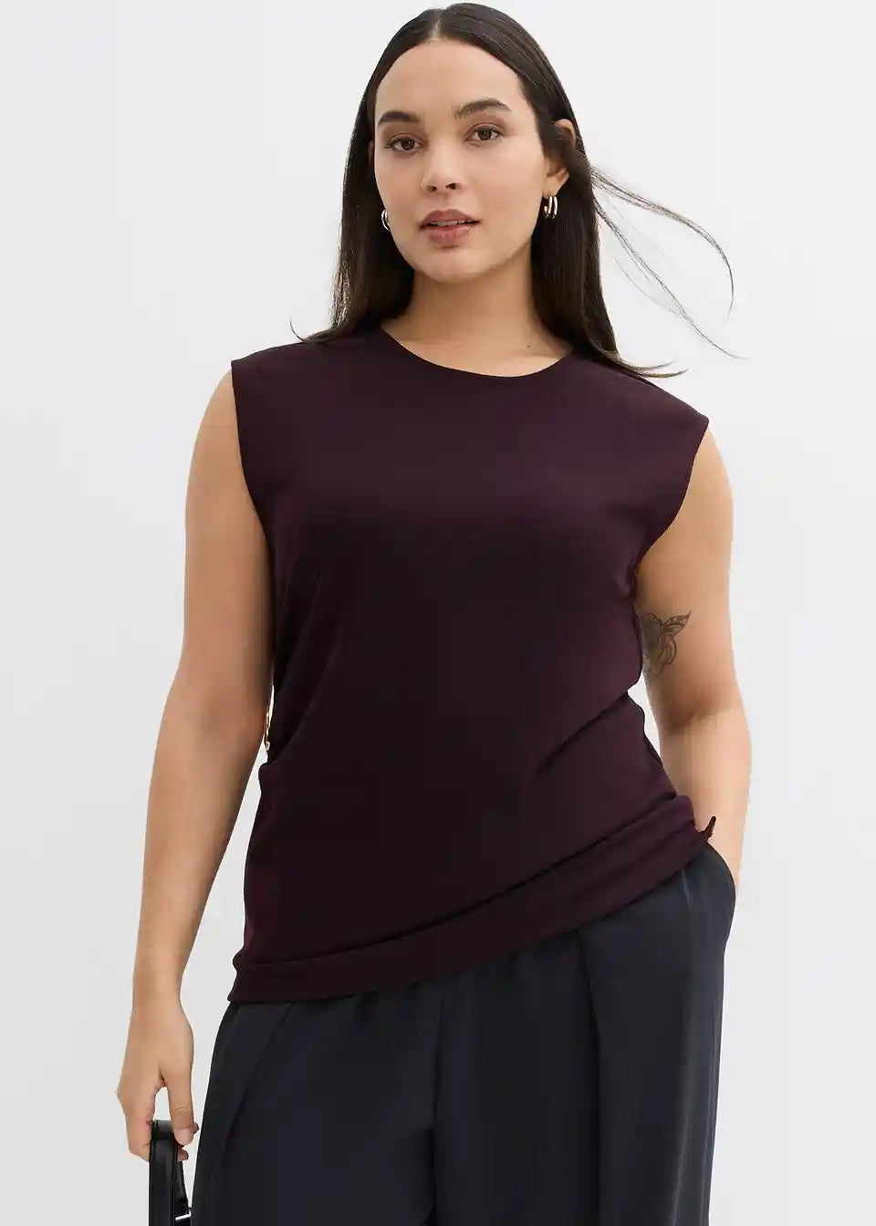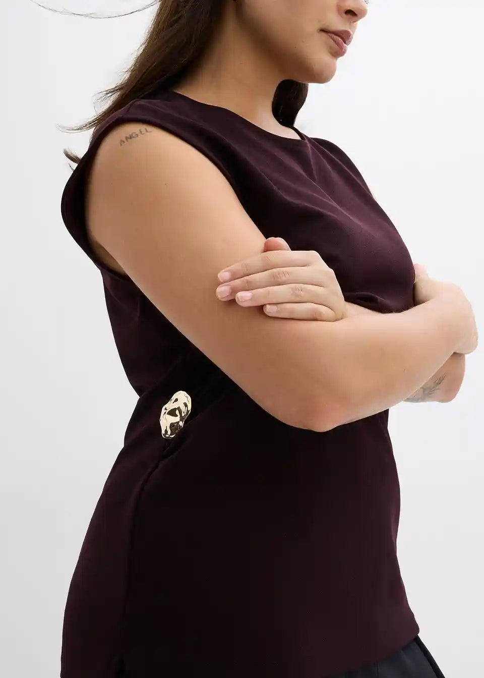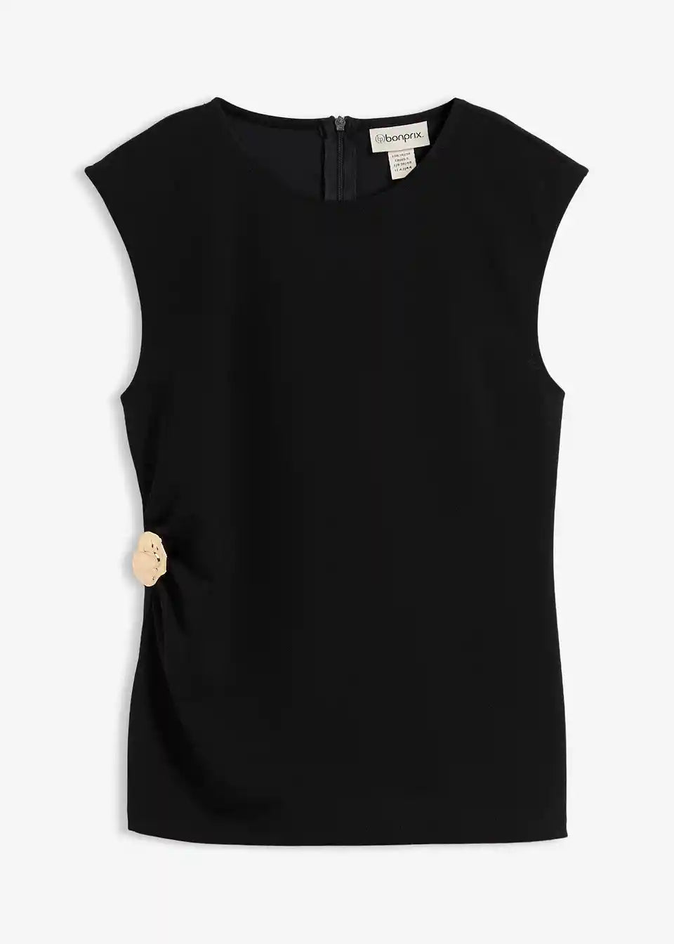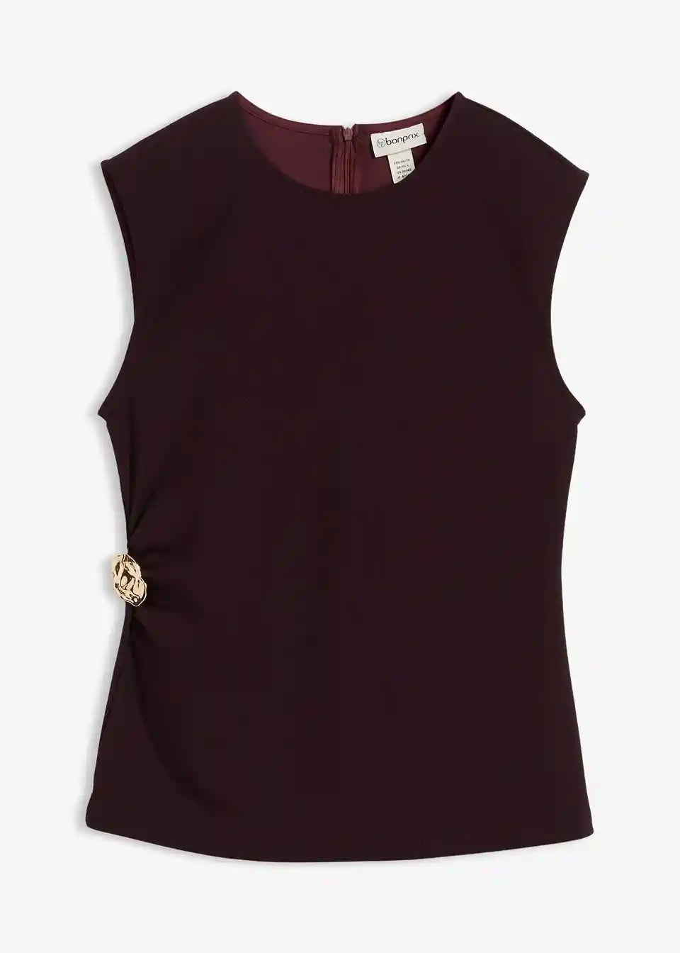 Ärmelloses Top mit Taillenfokus und Zierschnalle in der Taille. Verdeckter Reißverschluss hinten.