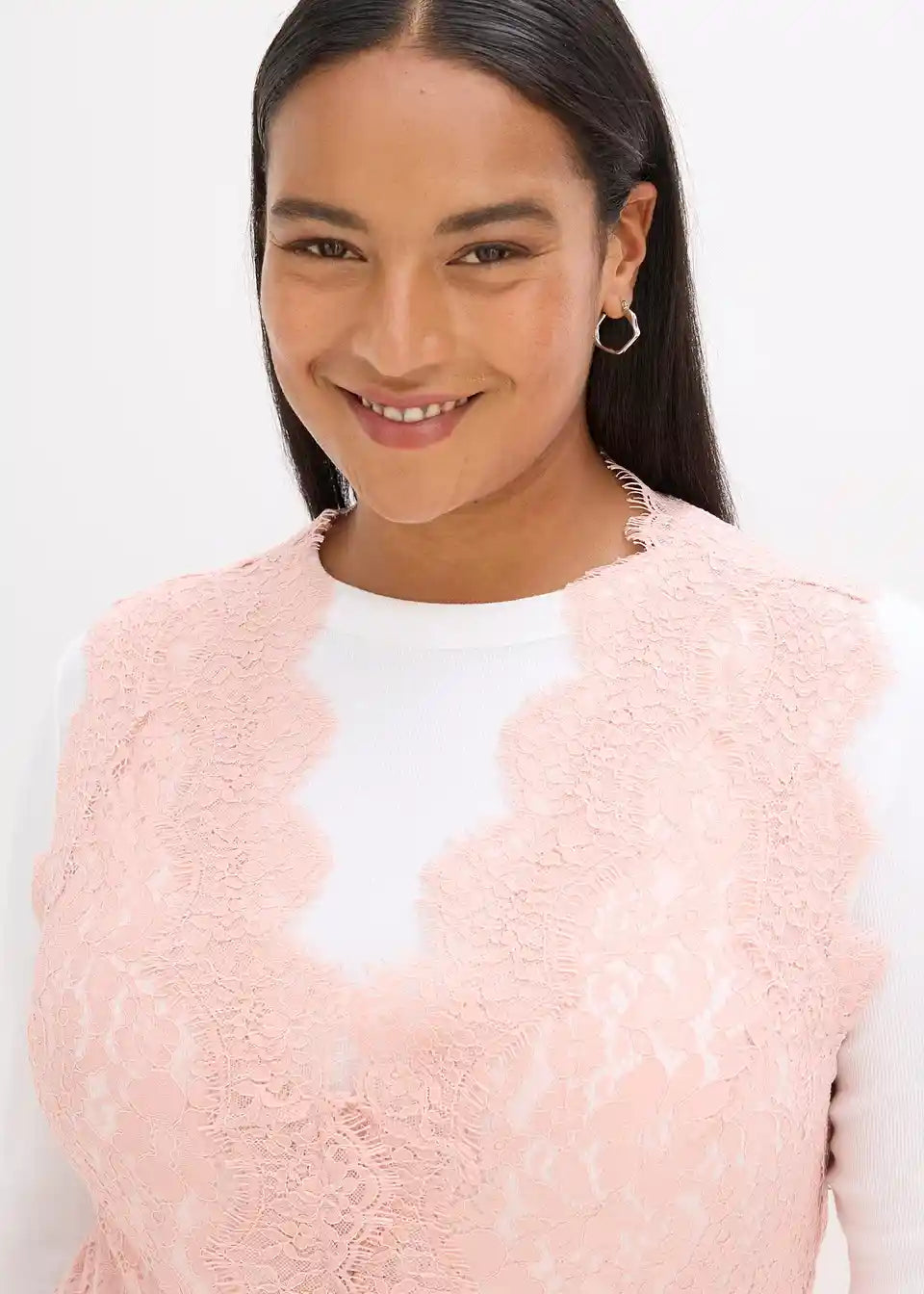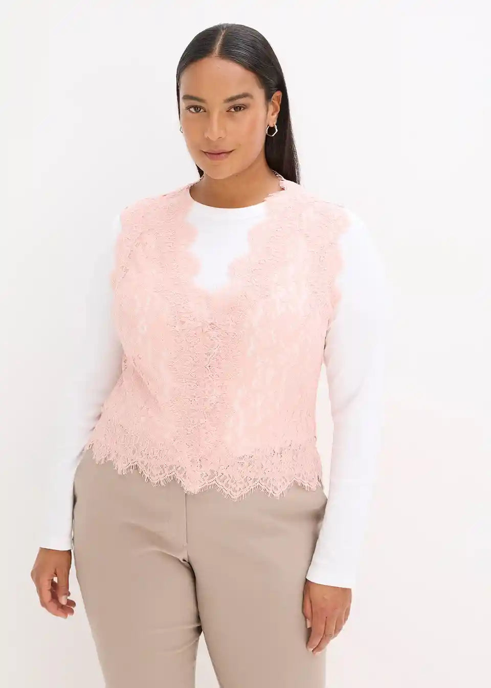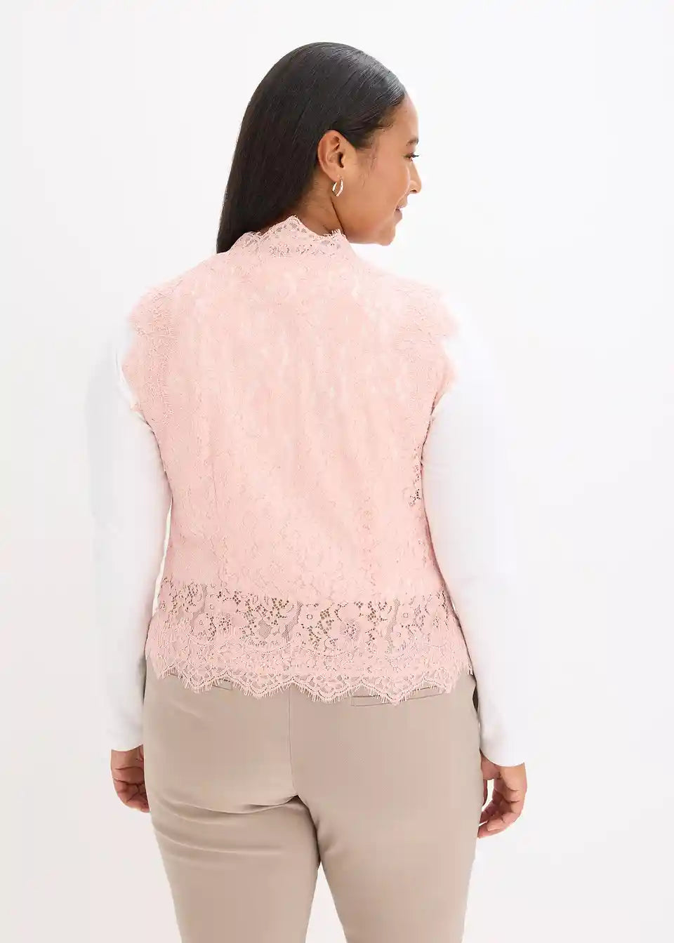 In Kombination mit einer Bluse oder einem schlichten Langarmshirt, ergibt diese elegante Spitzenweste ein elegantes Outfit.