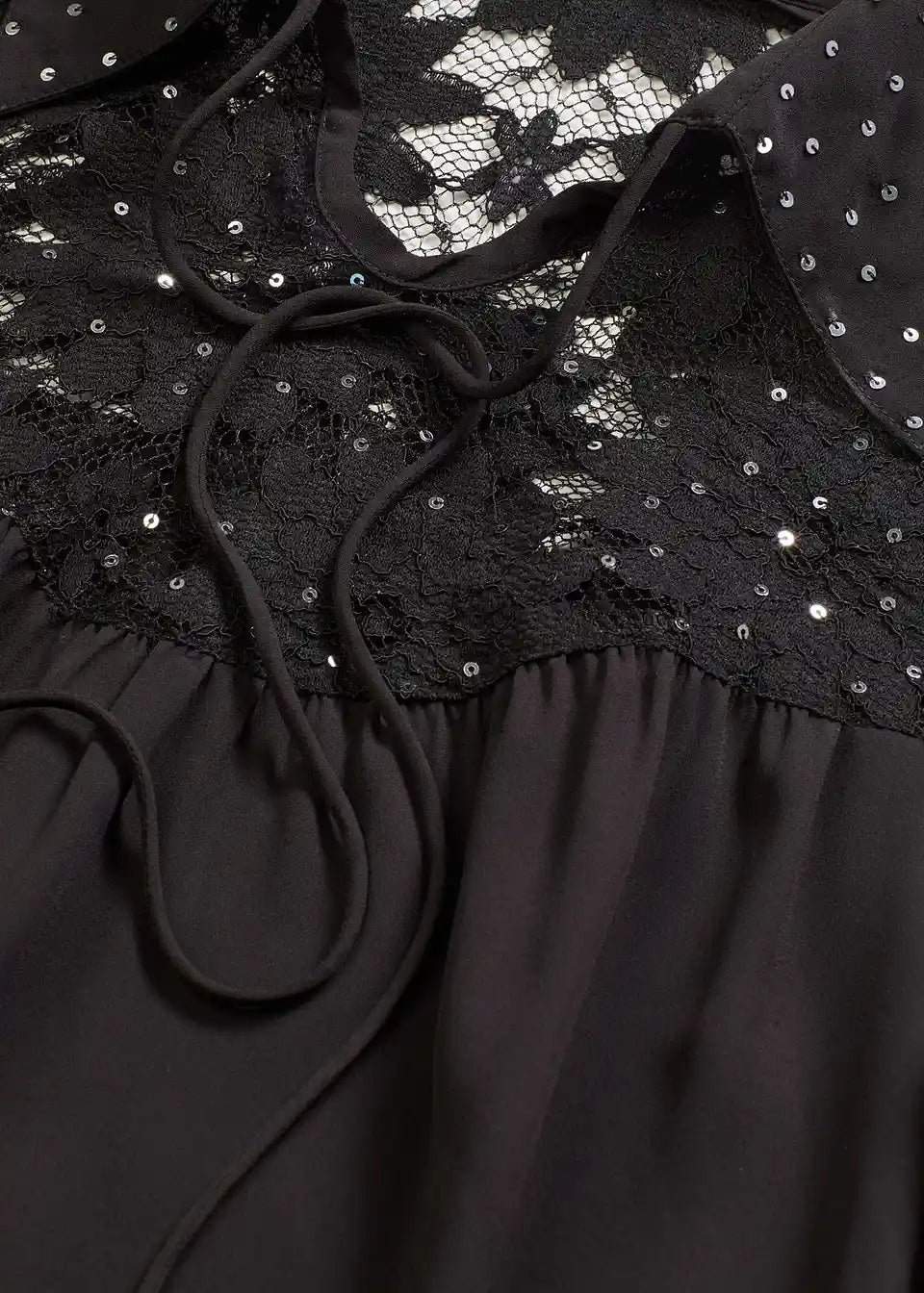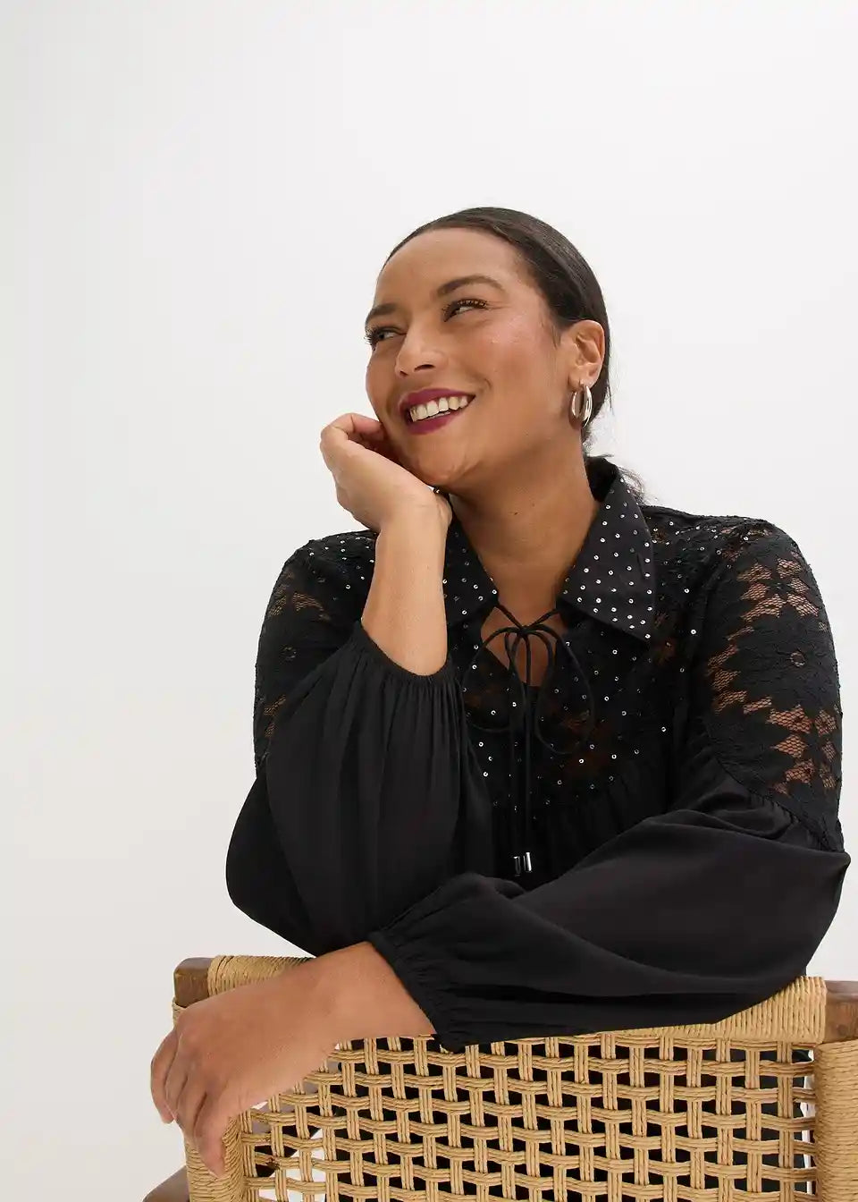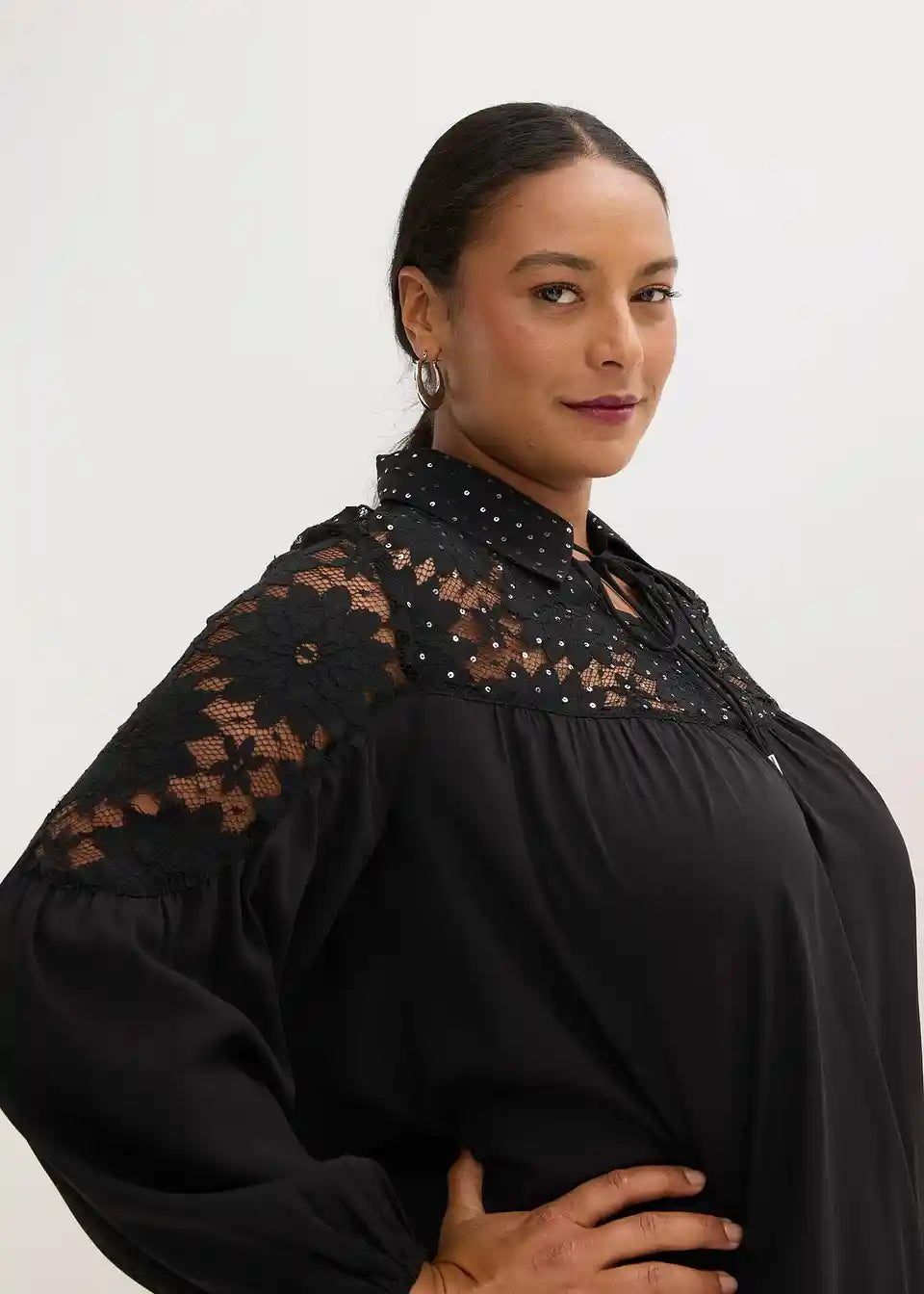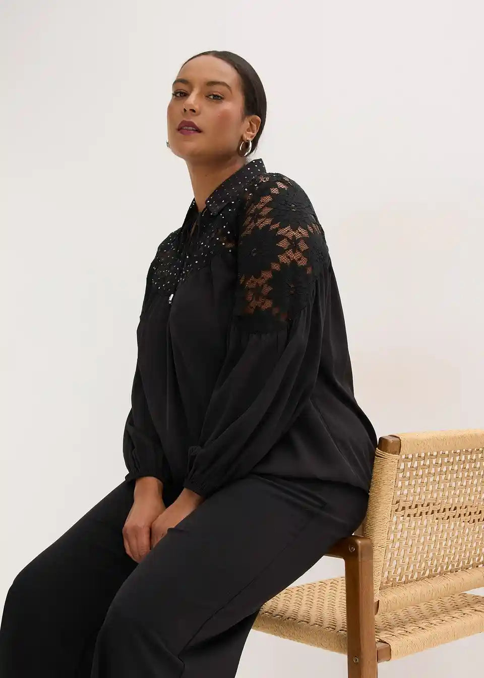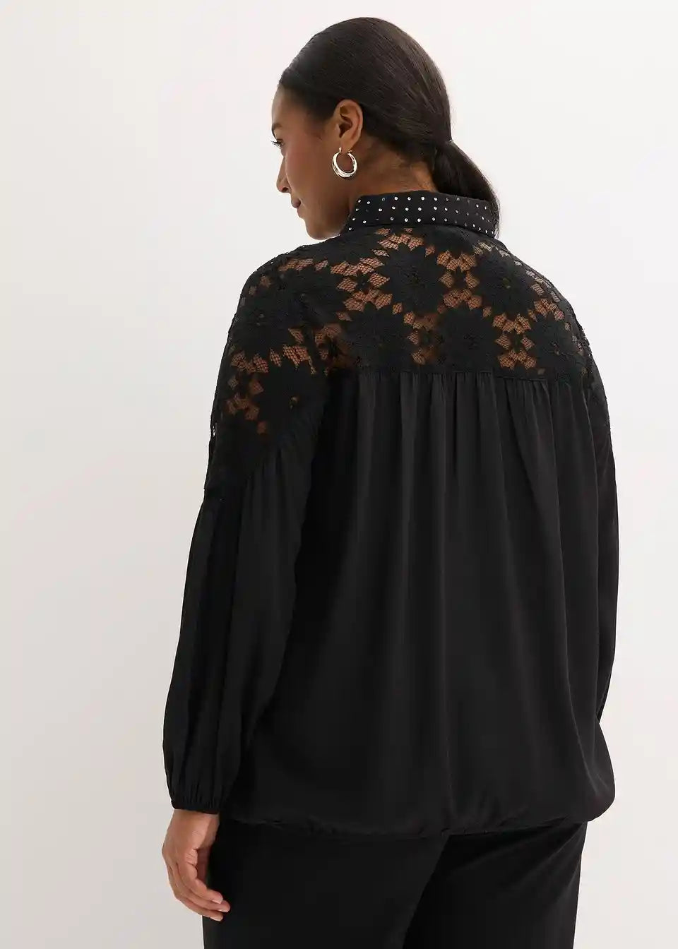 Verspielt und Modern: Bluse mit Spitzen-Einsatz und Schnürung am Kragen
