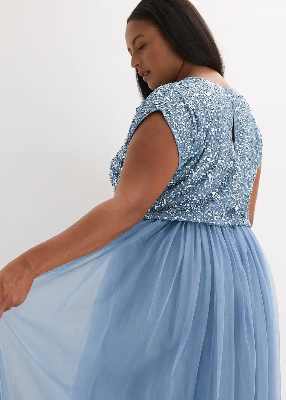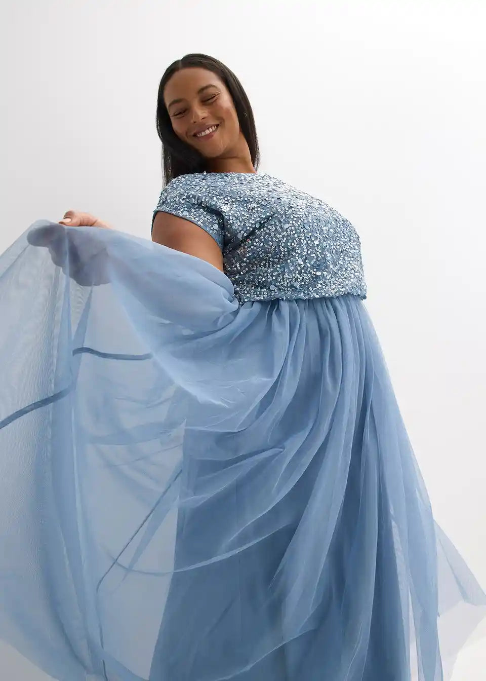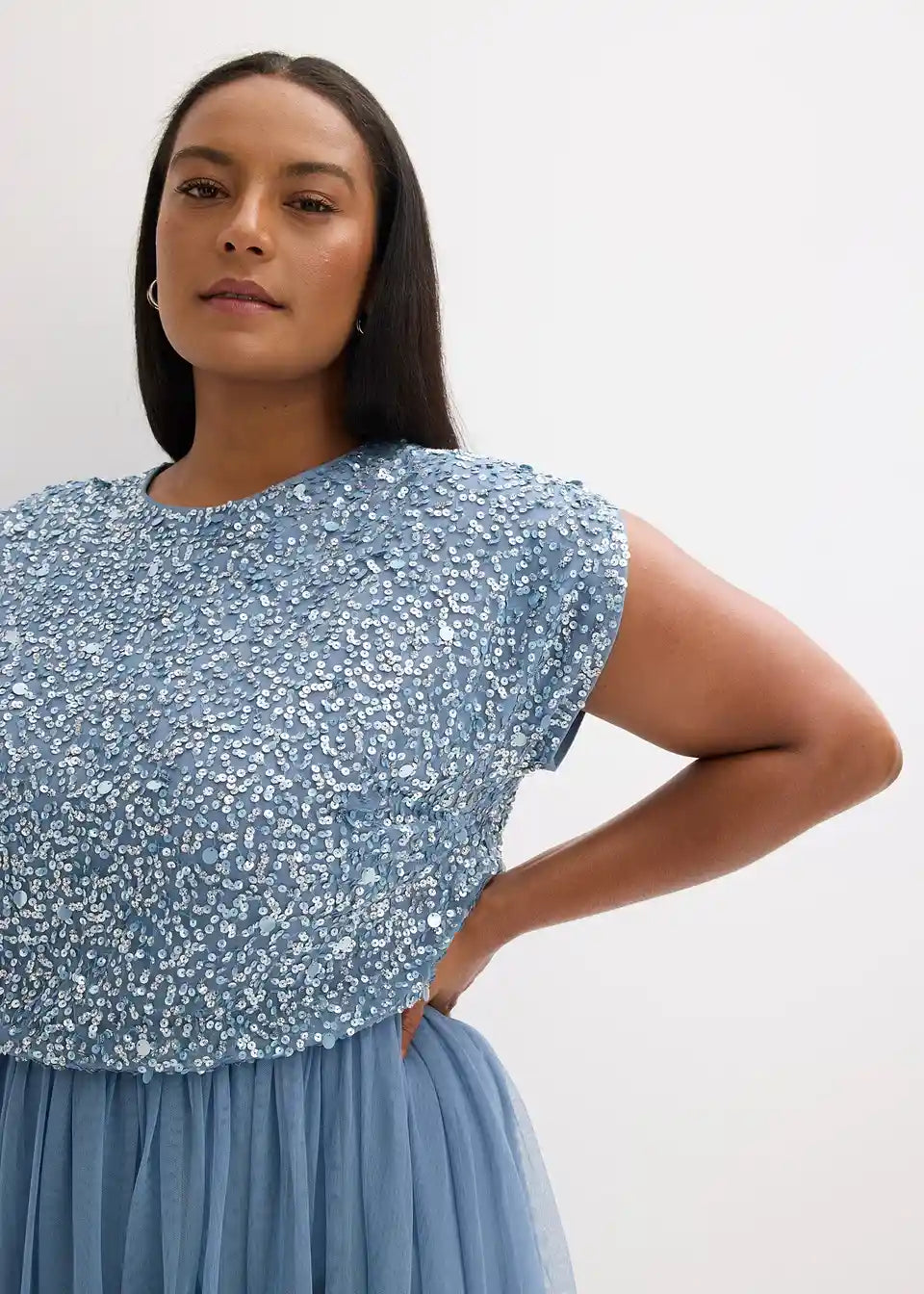 Modern und feminin: Abendkleid aus zartem Tüll mit Oversized Oberteil und Paillettenstickerei