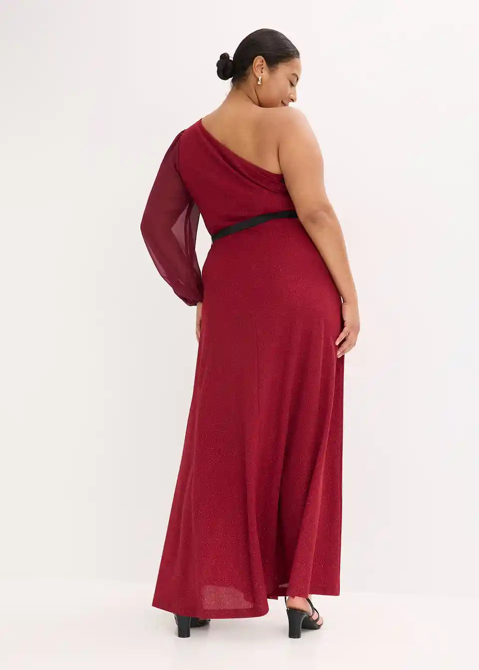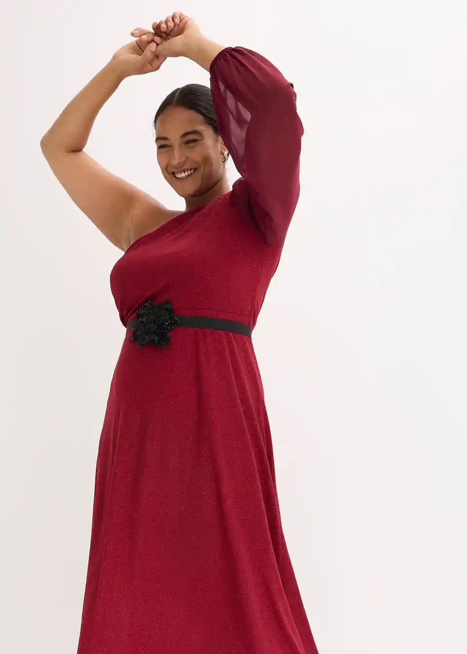 Glamourös und feminin: Abendkleid mit One-Shoulder-Ausschnitt und Glitzer in Maxi-Länge mit Blumen-Applikation an der Taille