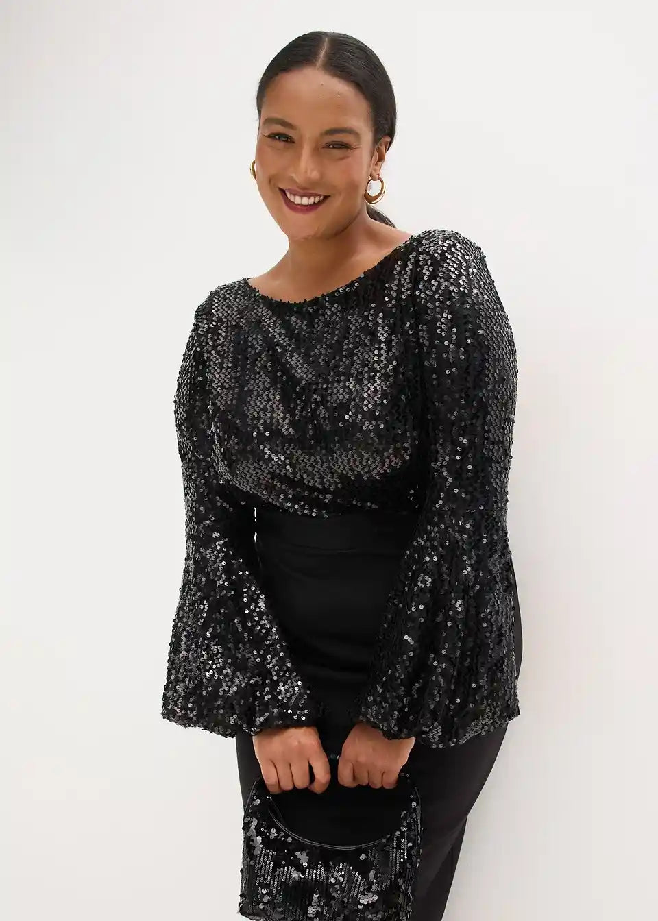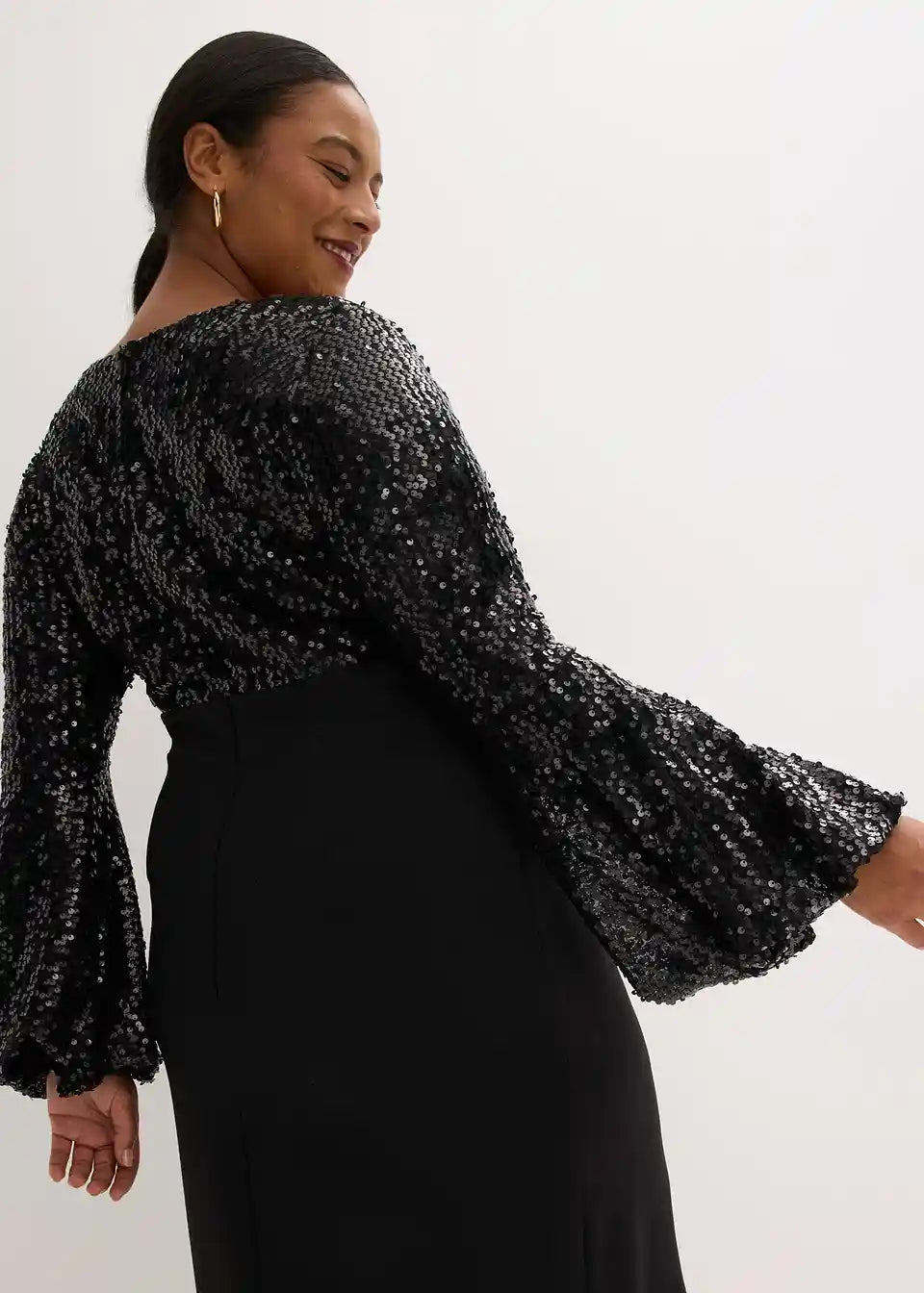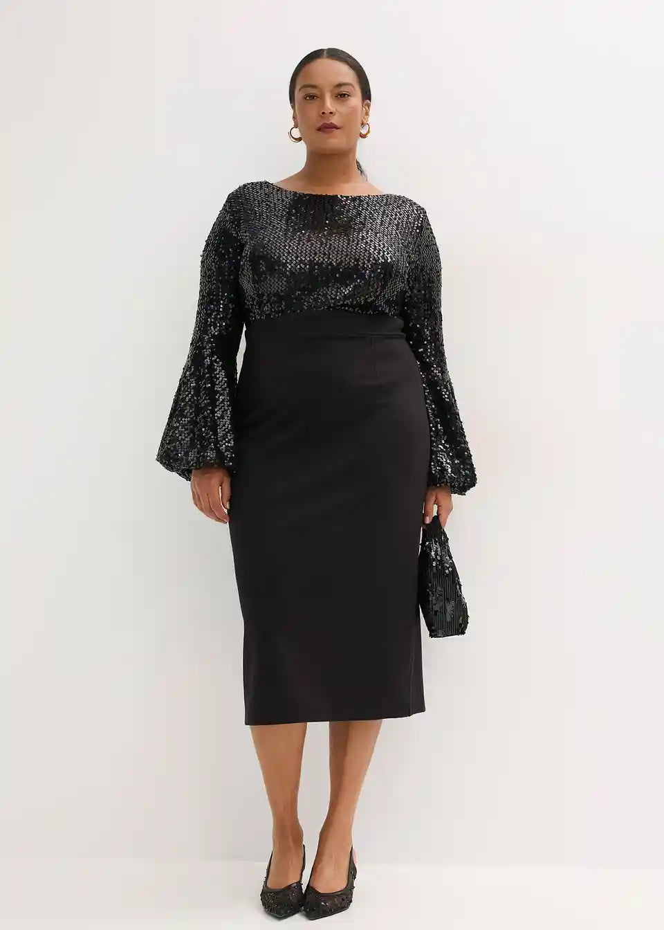 Modern und feminin: Midikleid mit Rock aus softem Scuba und einem Oberteil aus glänzenden Pailletten.