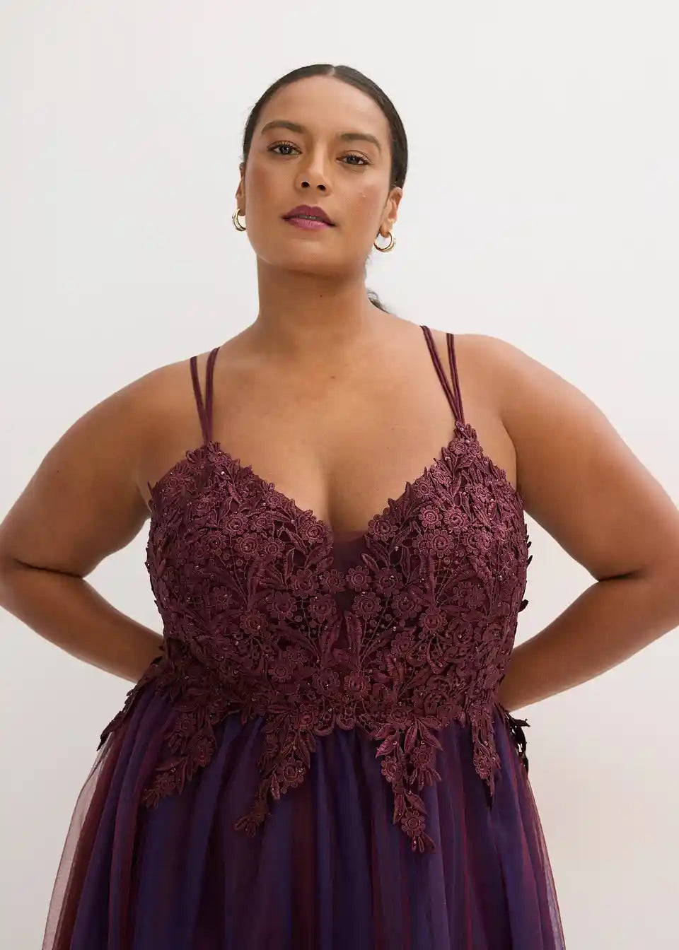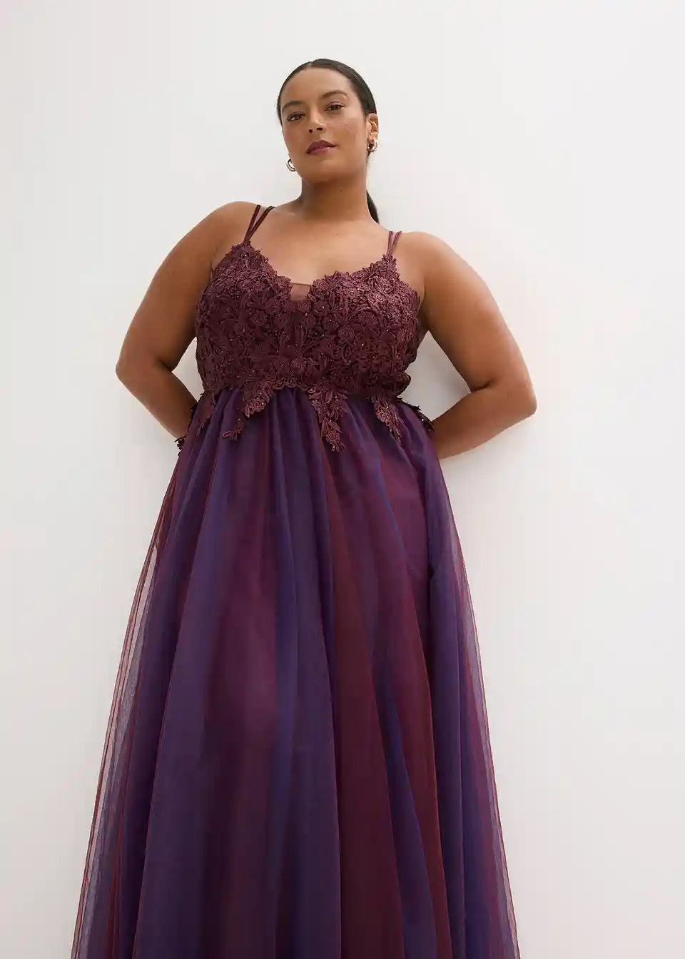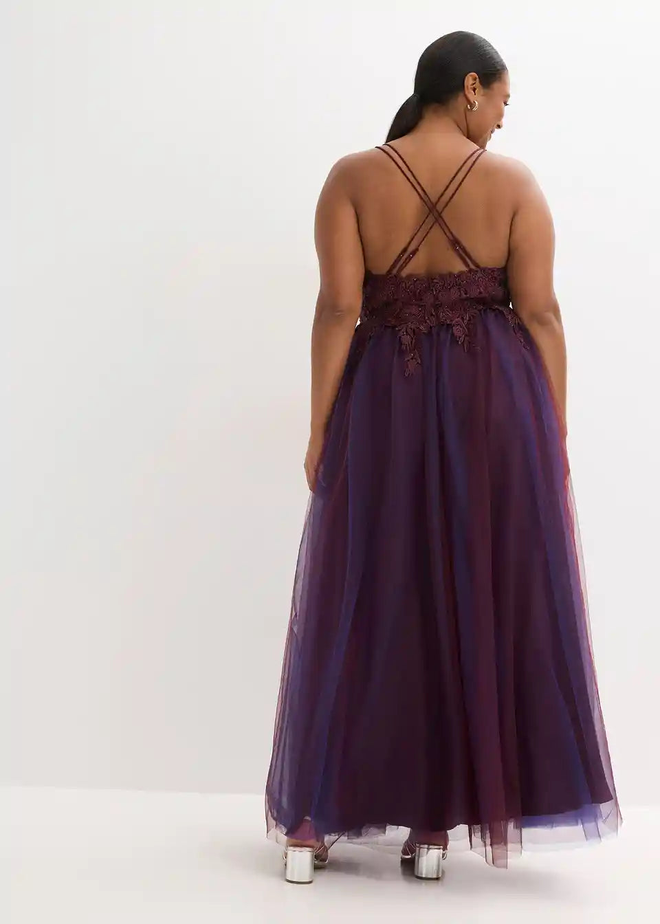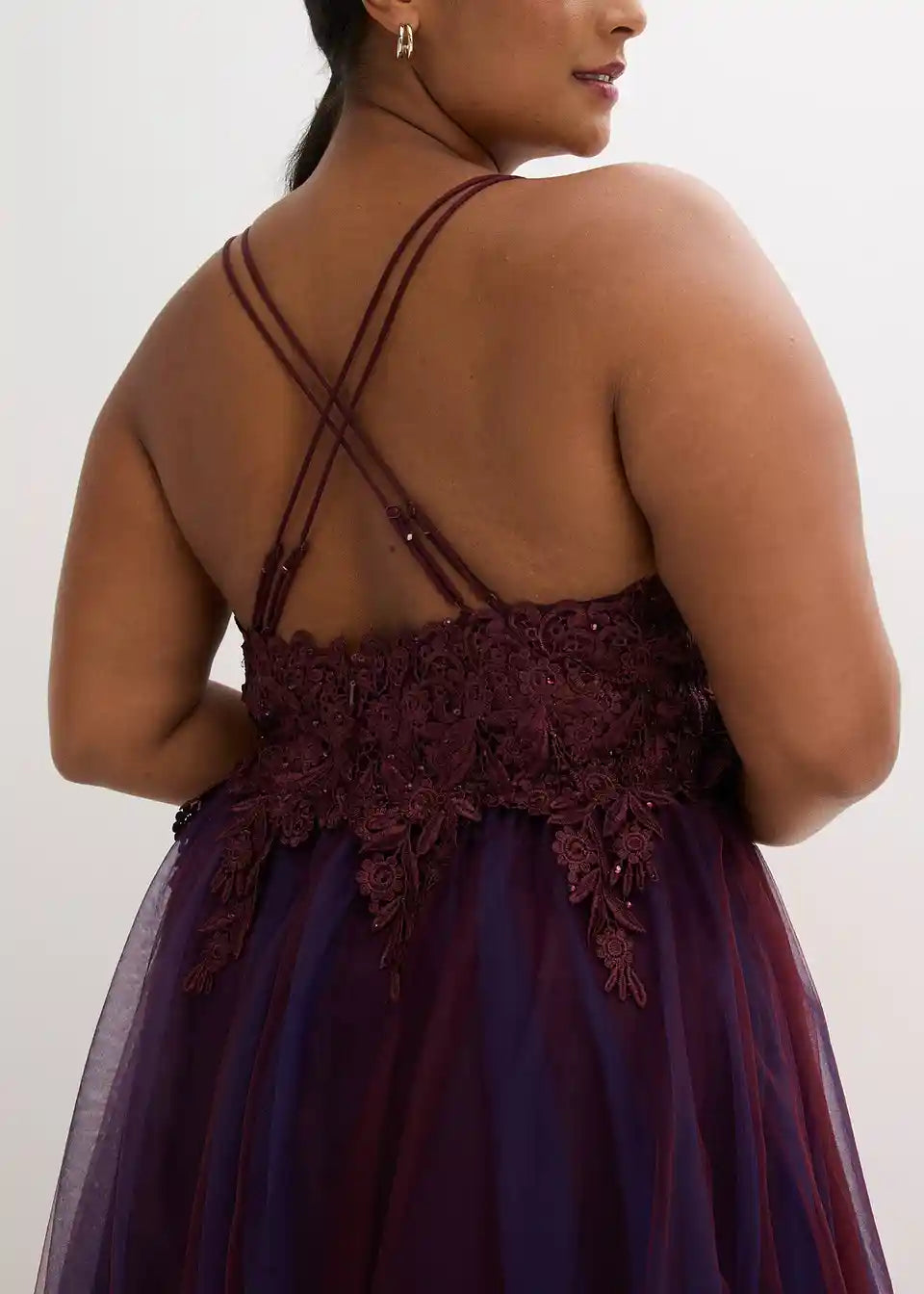 Modern und feminin: Bezauberndes Abendkleid aus zartem Tüll mit hochwertiger Spitze und überkreuzten Trägern am Rücken