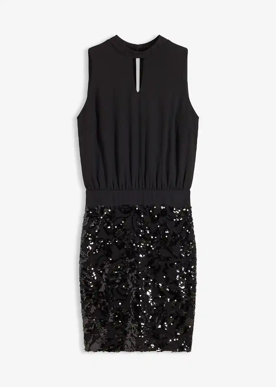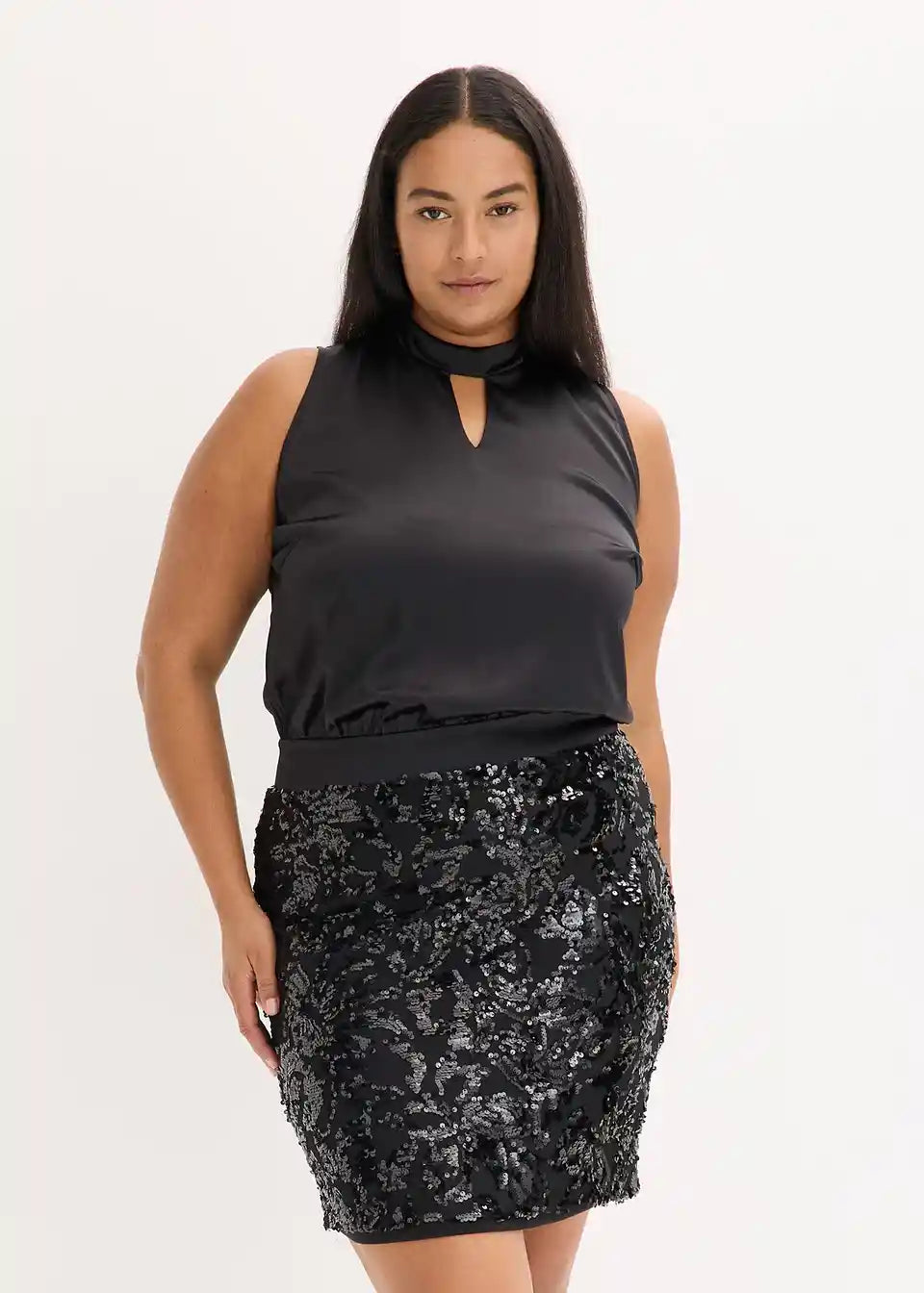 Modern und feminin: Minikleid mit Paillettenstickerei am Rock und glänzendem Oberteil.