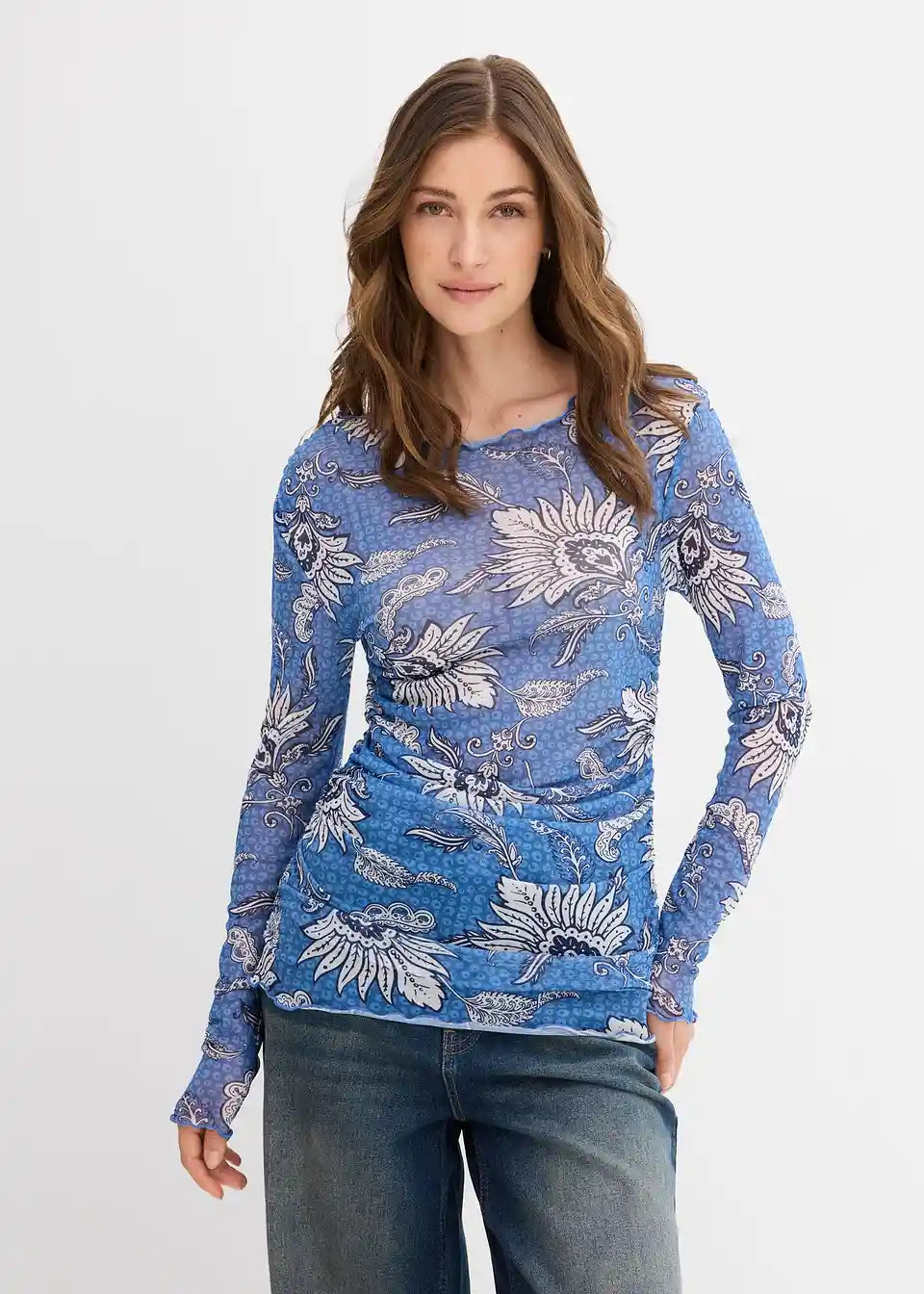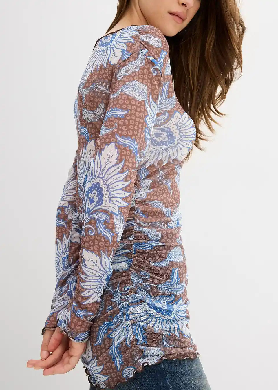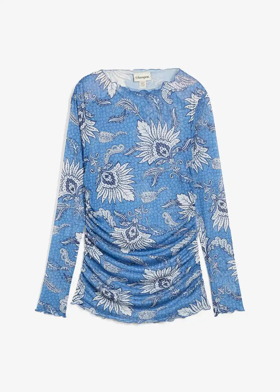 Bedrucktes Langarmshirt aus feinem Mesh mit Raffungen
