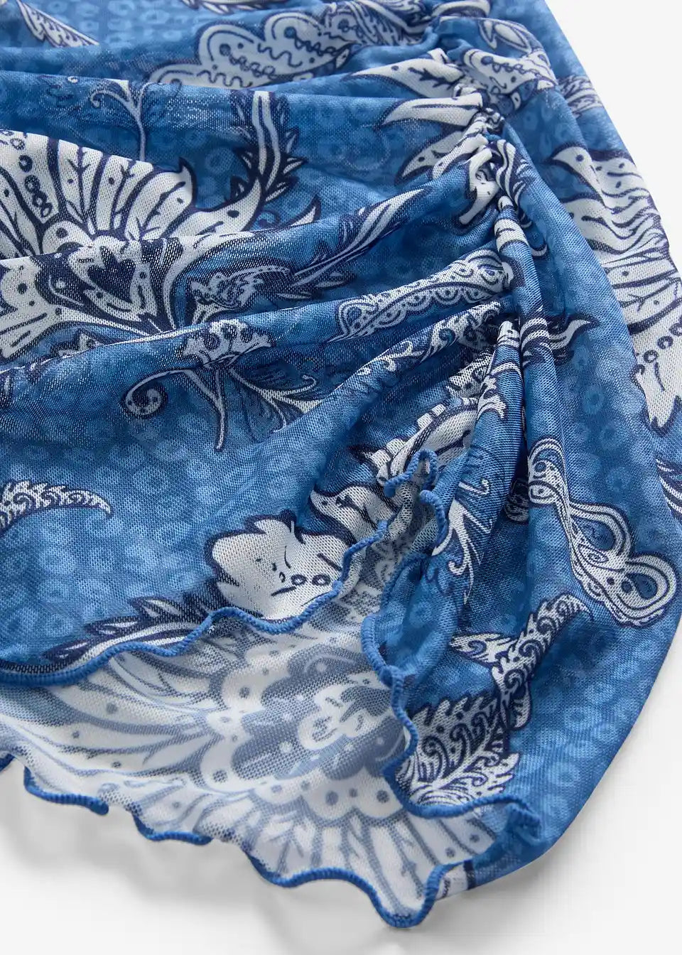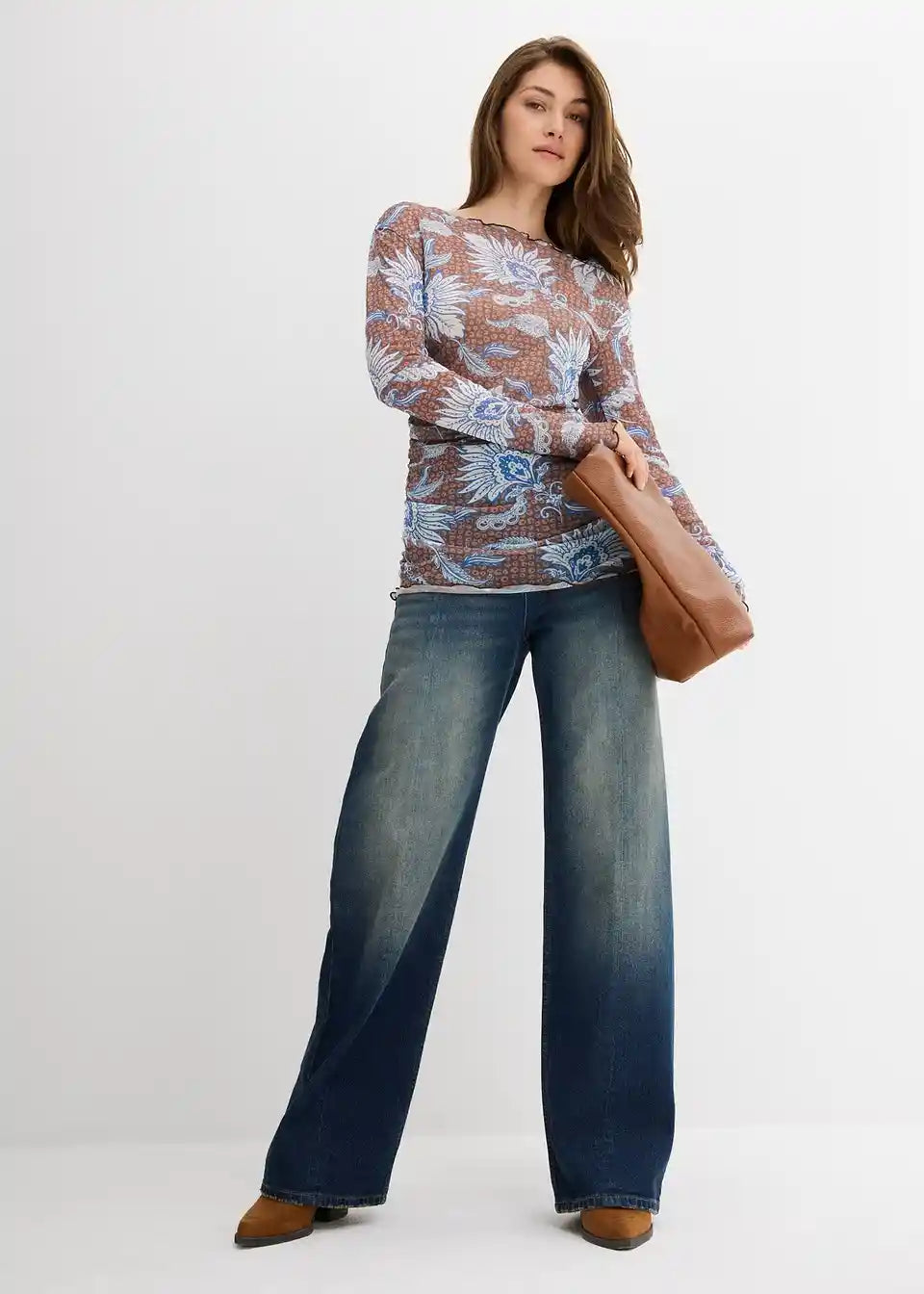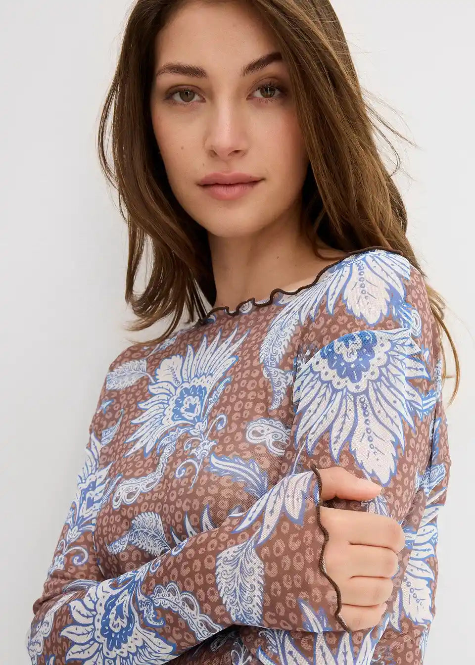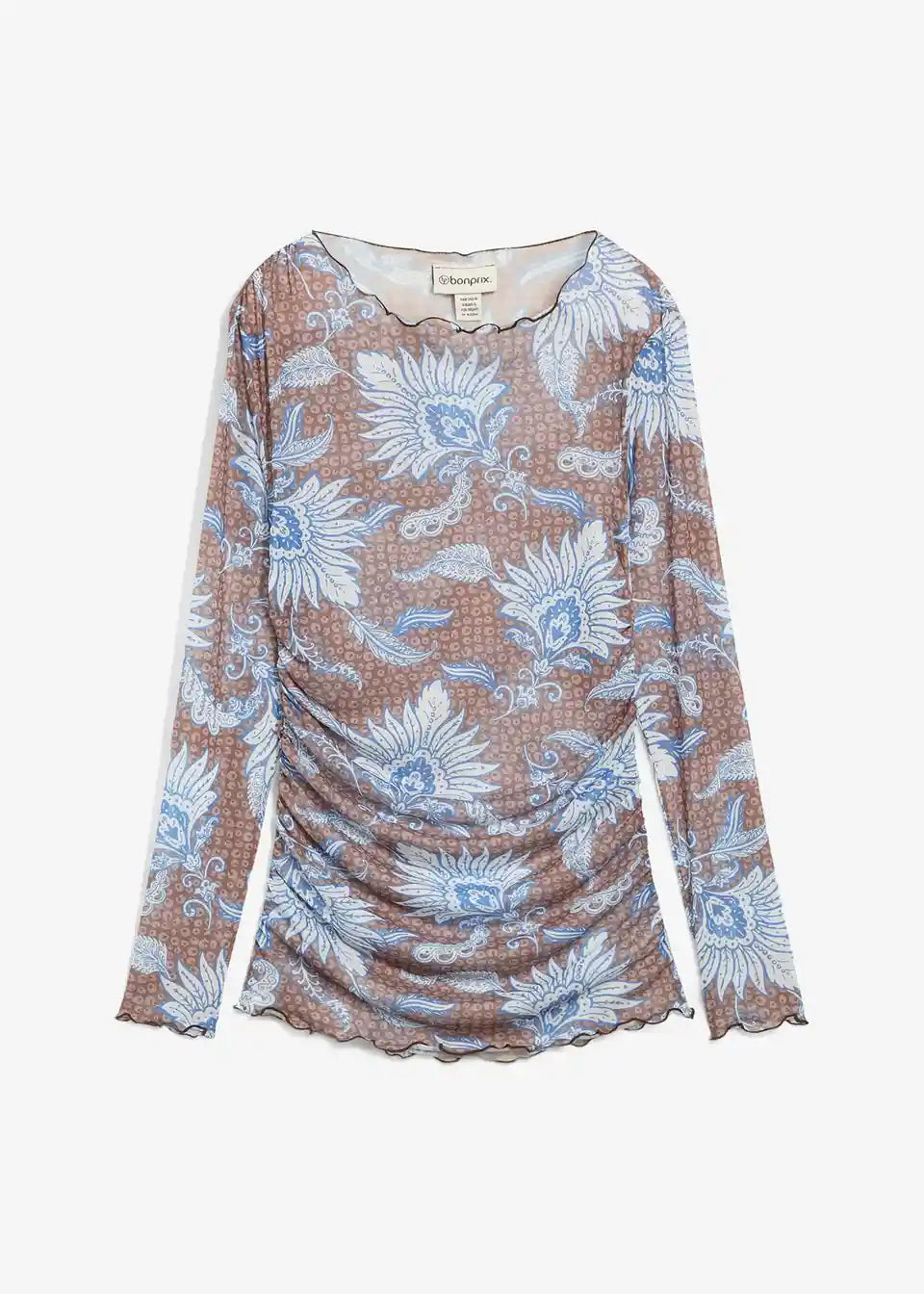 Bedrucktes Langarmshirt aus feinem Mesh mit Raffungen