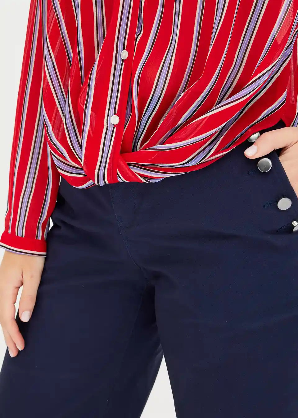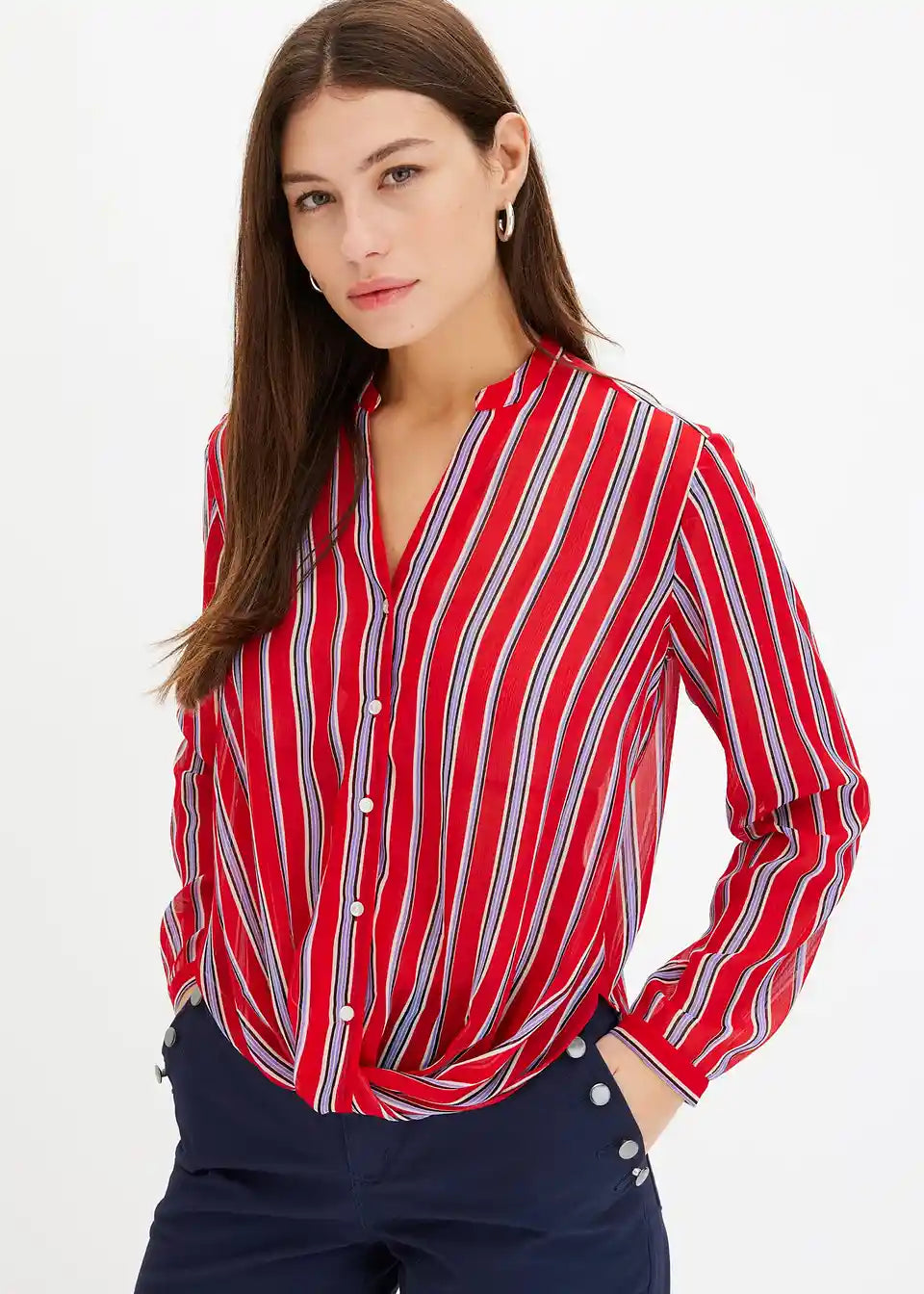modische Bluse mit Streifen-Print und Drapierung vorne am Saum