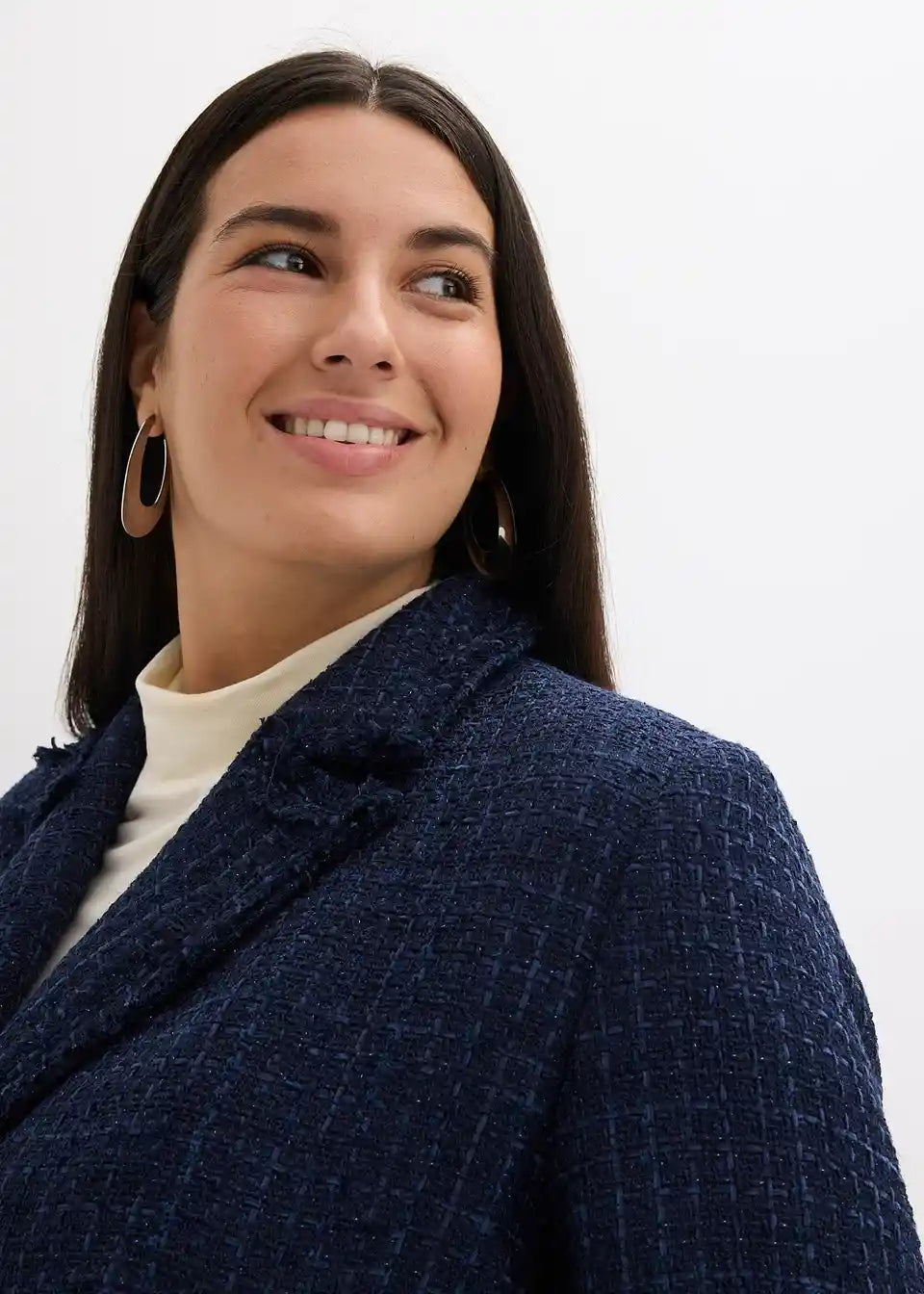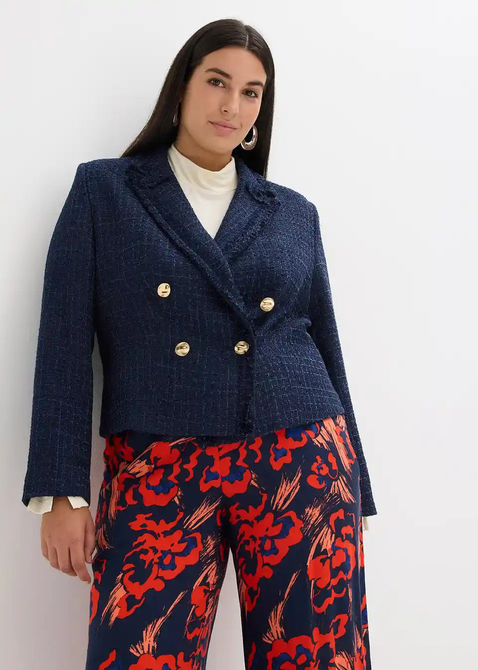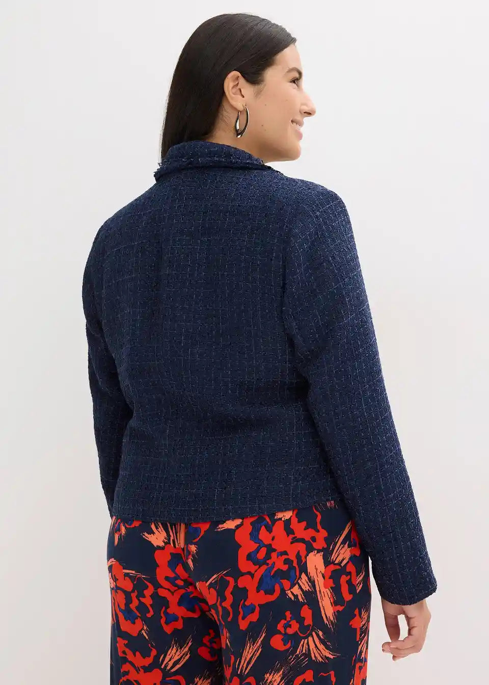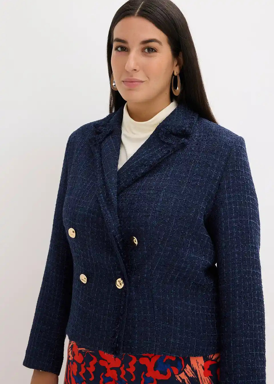 verkürzter Bouclé-Blazer mit dekorativen goldfarbenen Metall-Knöpfen und kleiner Fransenkante am Revers