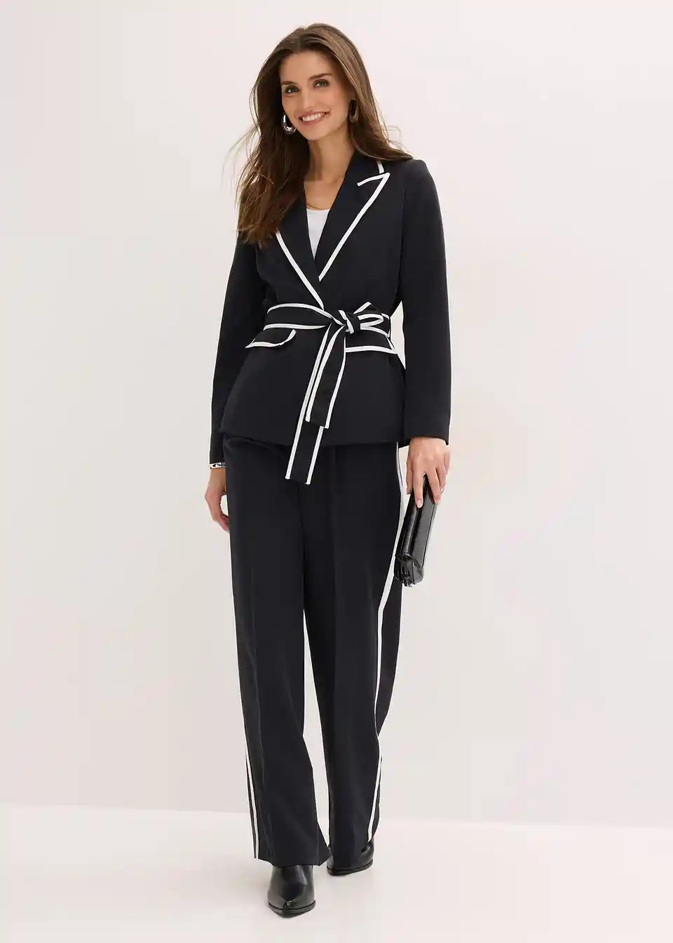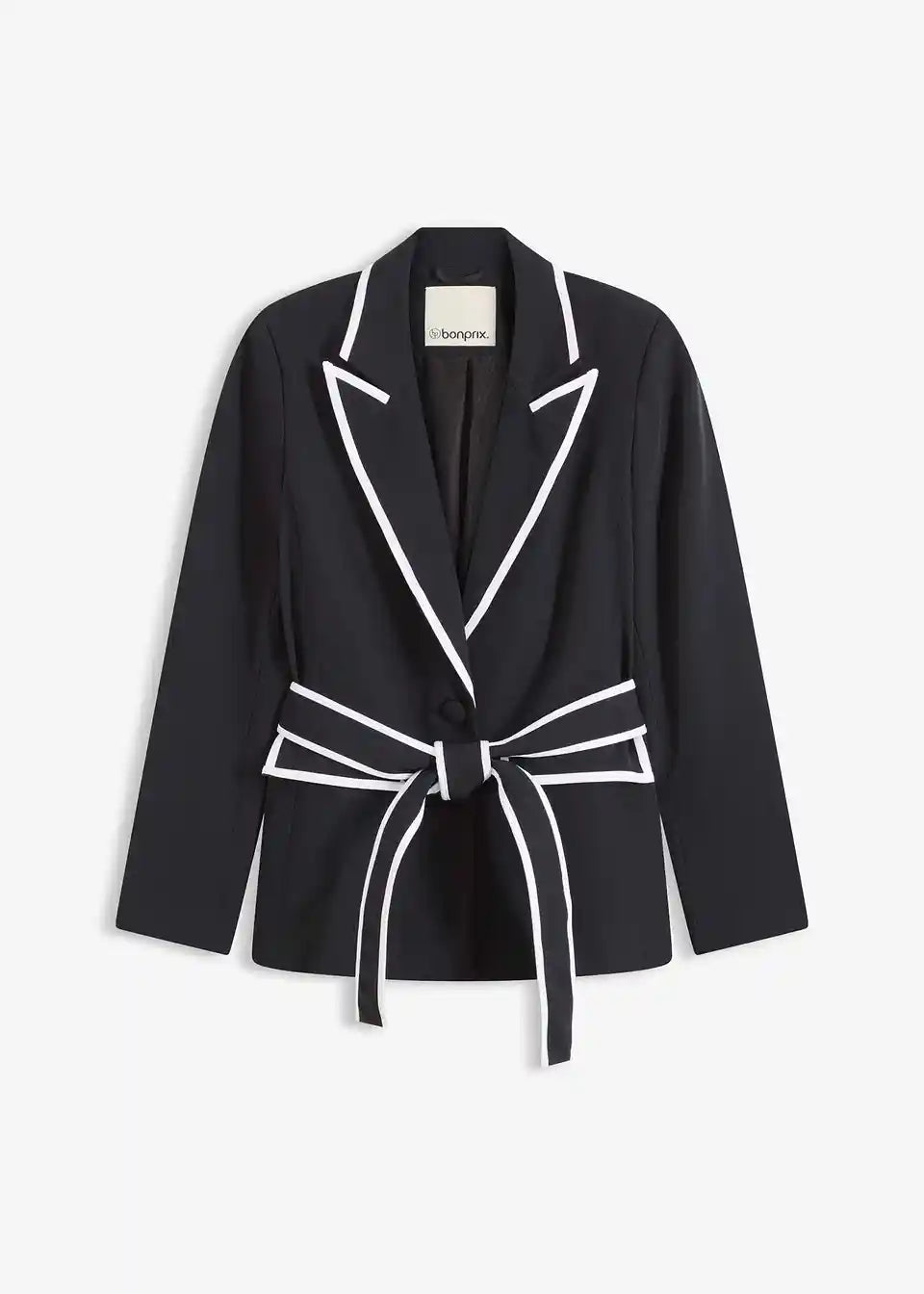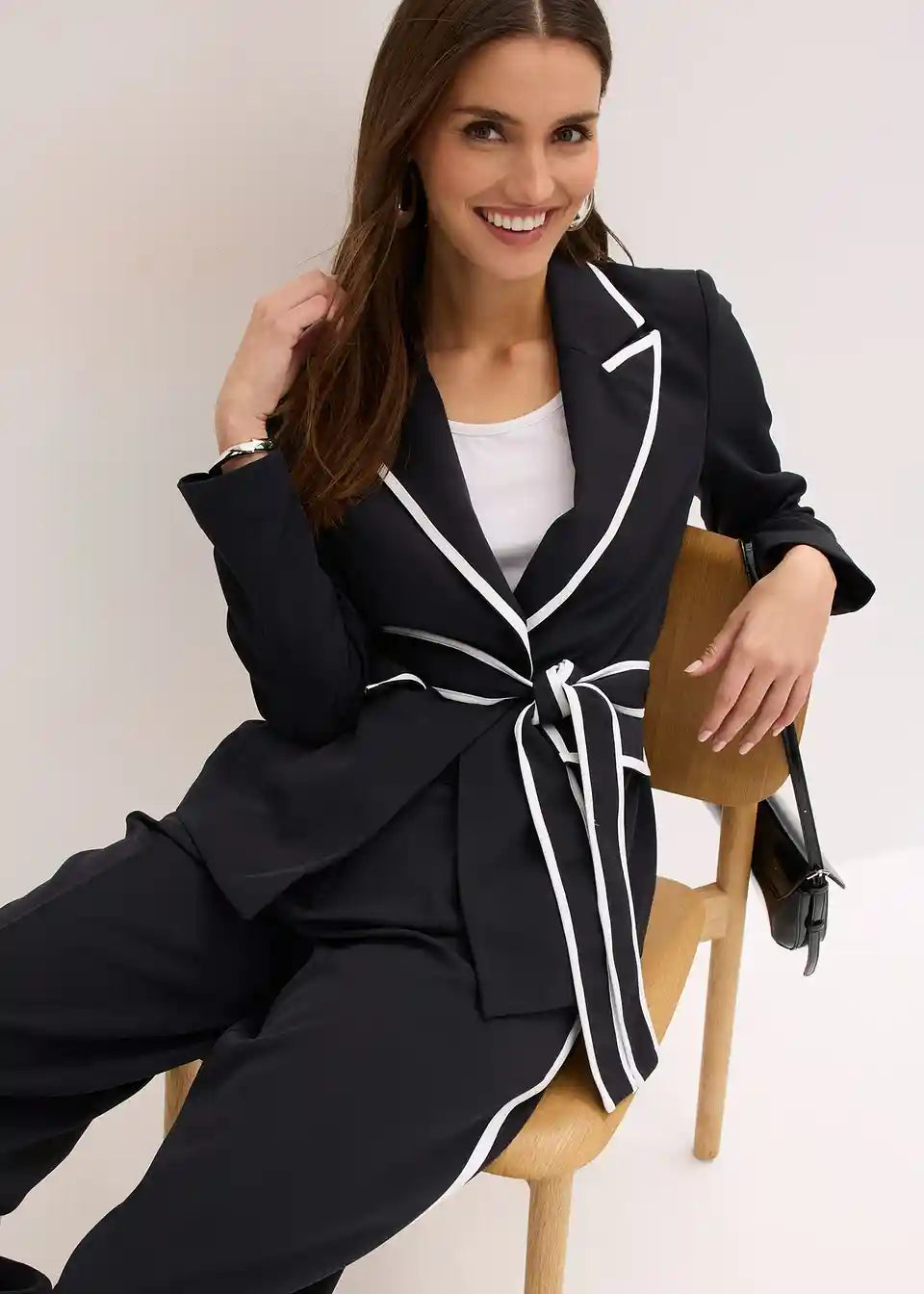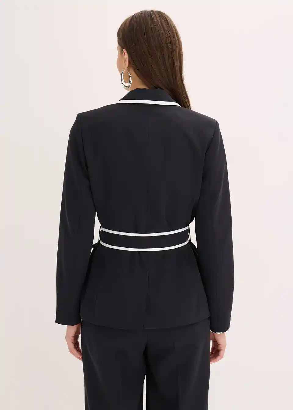 modischer Blazer mit Taillengürtel und Paspelierungen in Kontrastfarbe