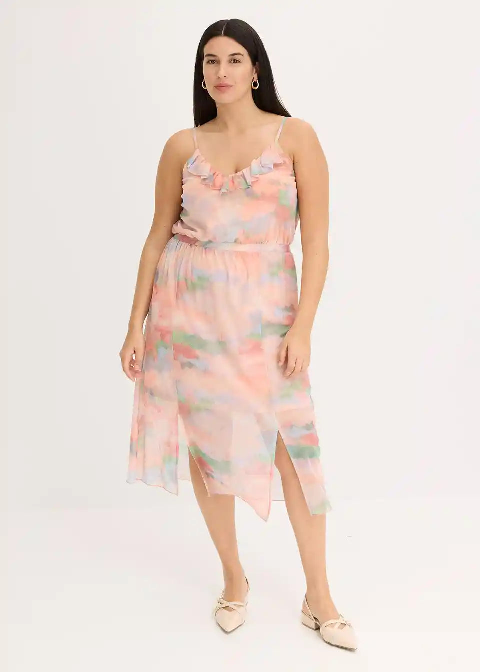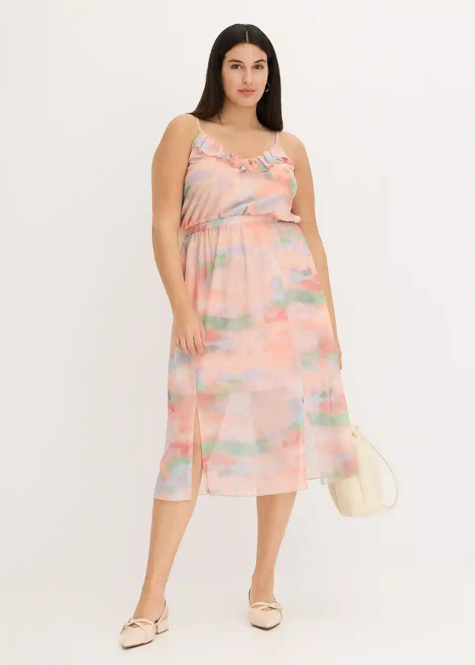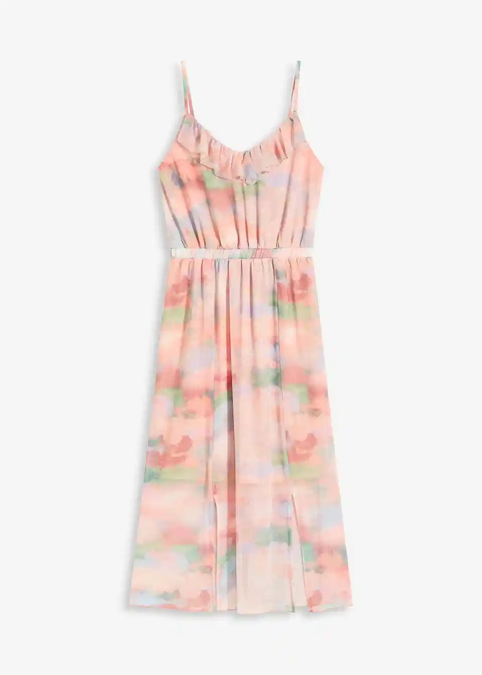 modisch bedrucktes Jerseykleid aus softem Mesh mit verstellbaren Spaghetti-Trägern und Volant vorne am Ausschnitt