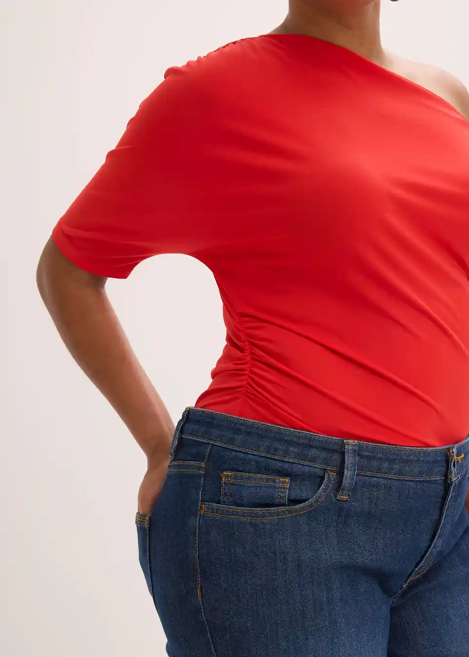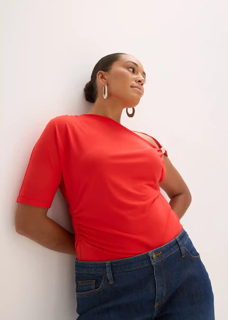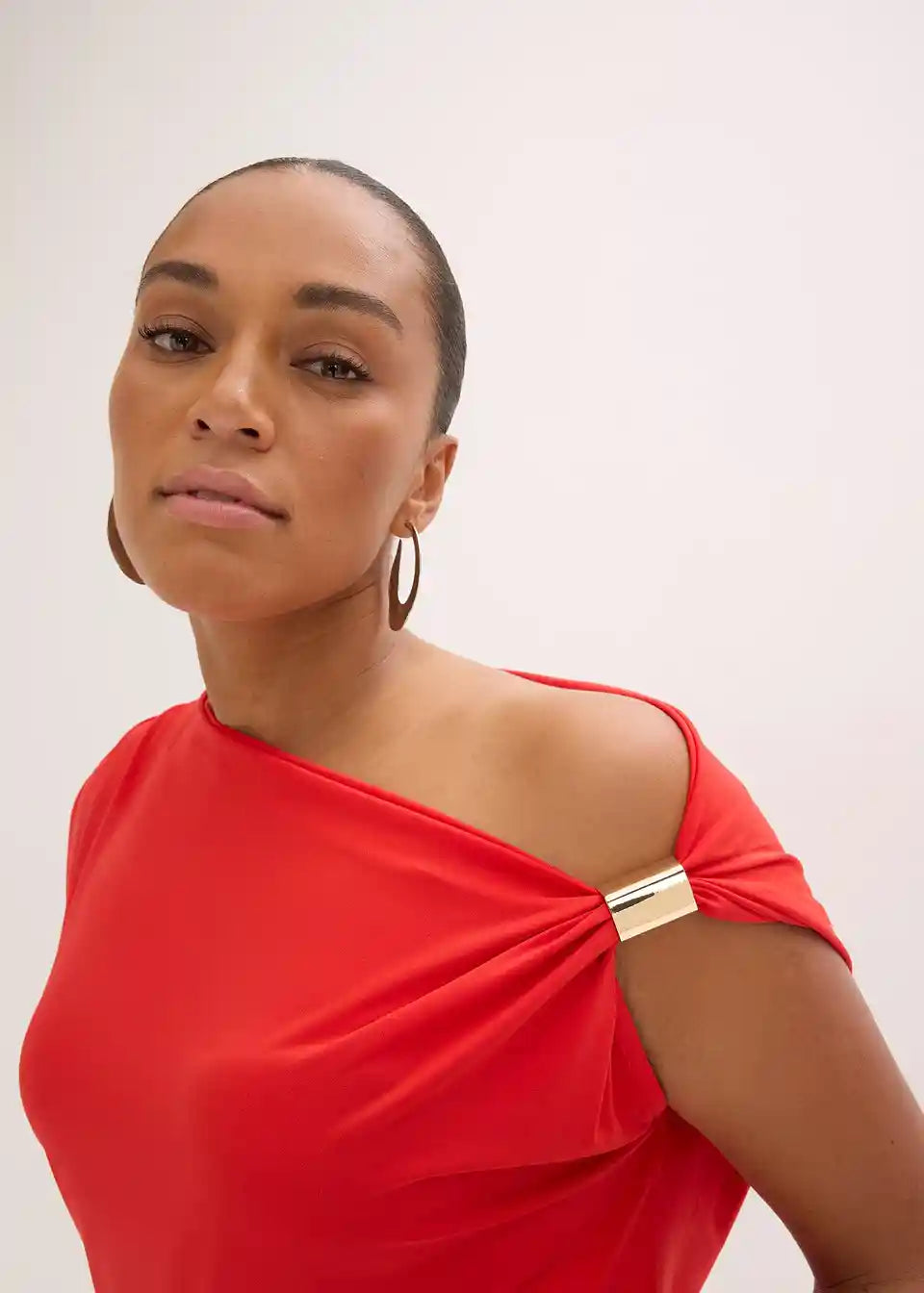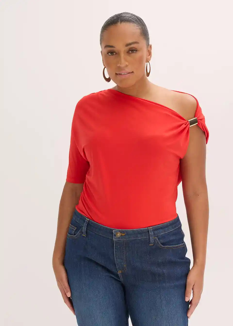 Shirt mit asymmetrischem Ausschnitt und mit Drapierung und Metallapplikation an der Schulter.