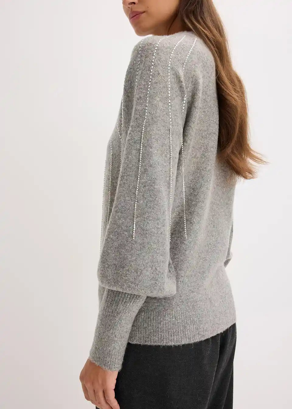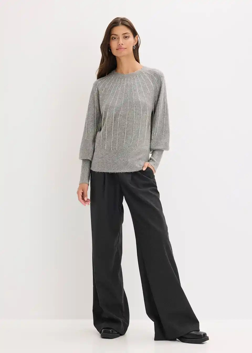 femininer Strickpullover mit Ballonärmeln und modischen Strass-Applikationen mit Fransen-Details vorne