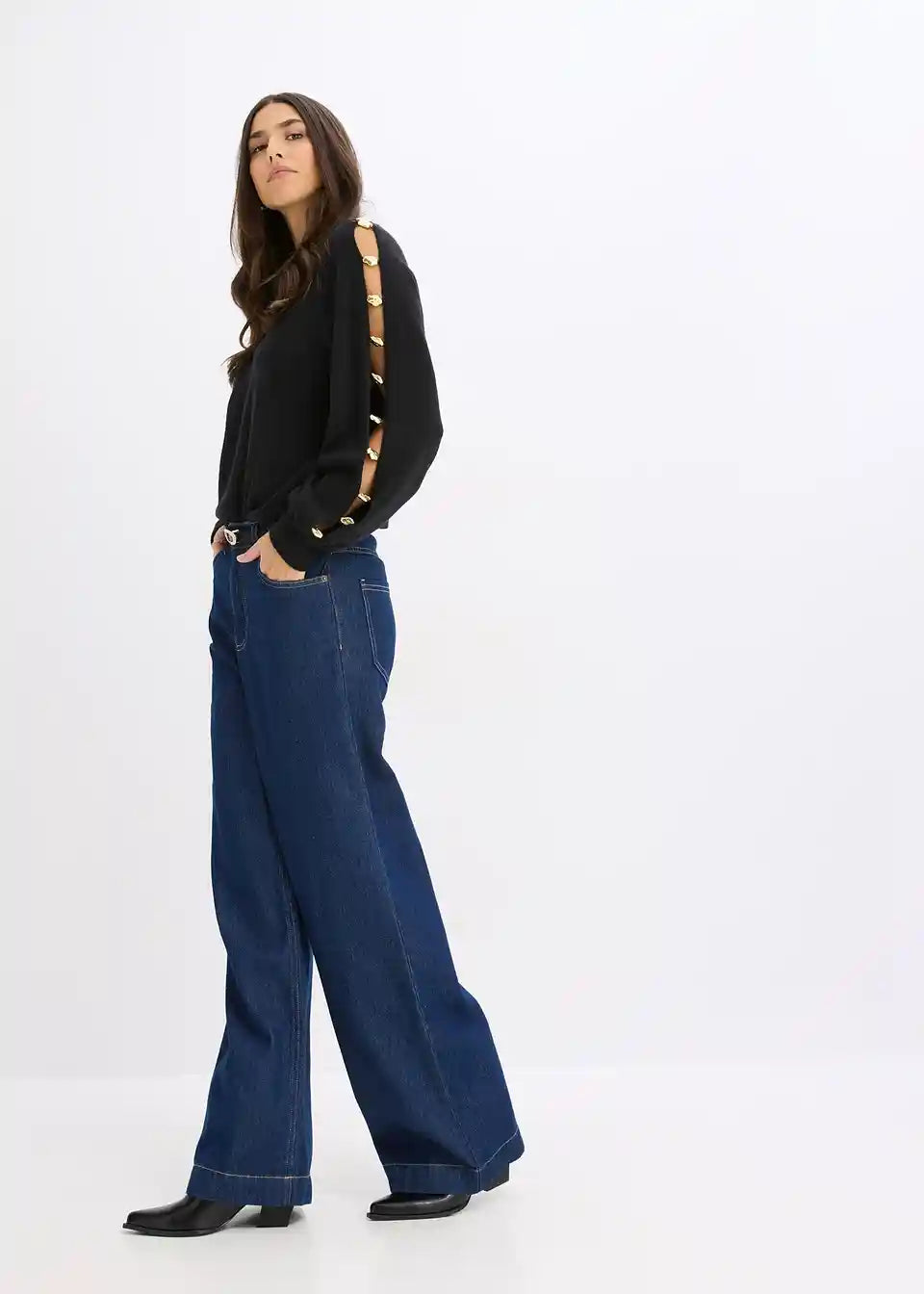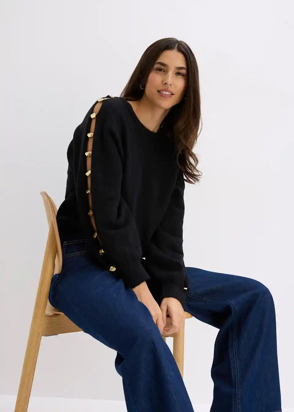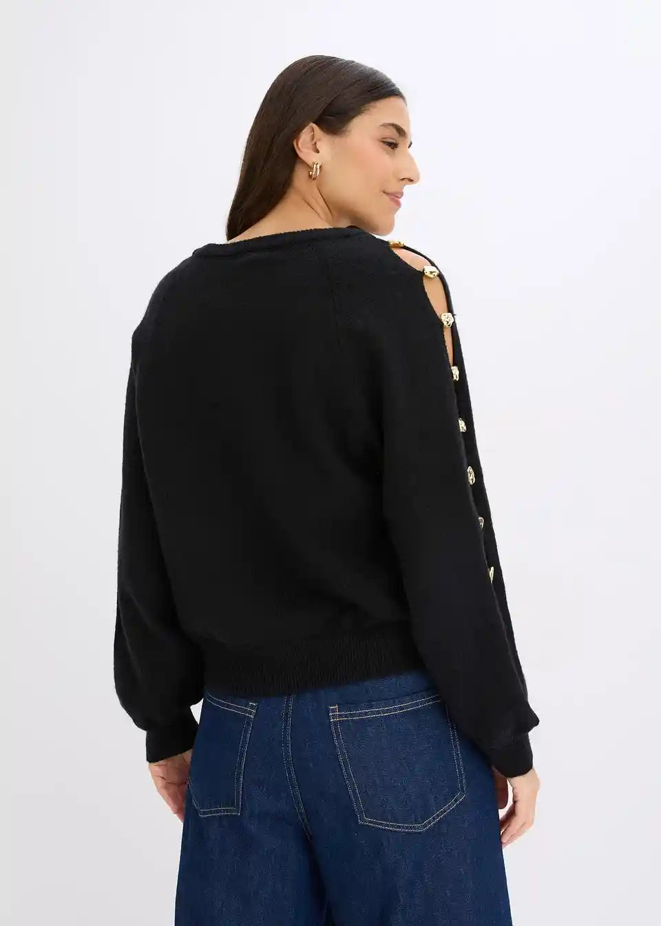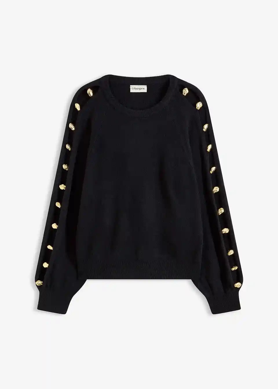 Pullover mit Rundhalsausschnitt und langen Ärmeln mit Schlitz und Applikation aus goldfarbenen Metall-Perlen